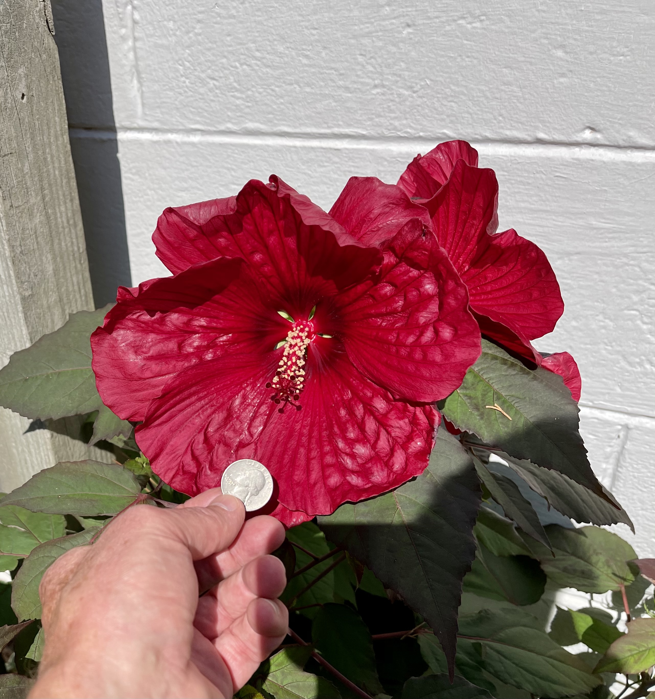 Evelyn’s flowers evolve each week to grace our yard throughout the season – even when it’s hot. This is one of the many hibiscus following the sun around each morning. They’re enormous; I couldn’t resist adding a quarter for scale: