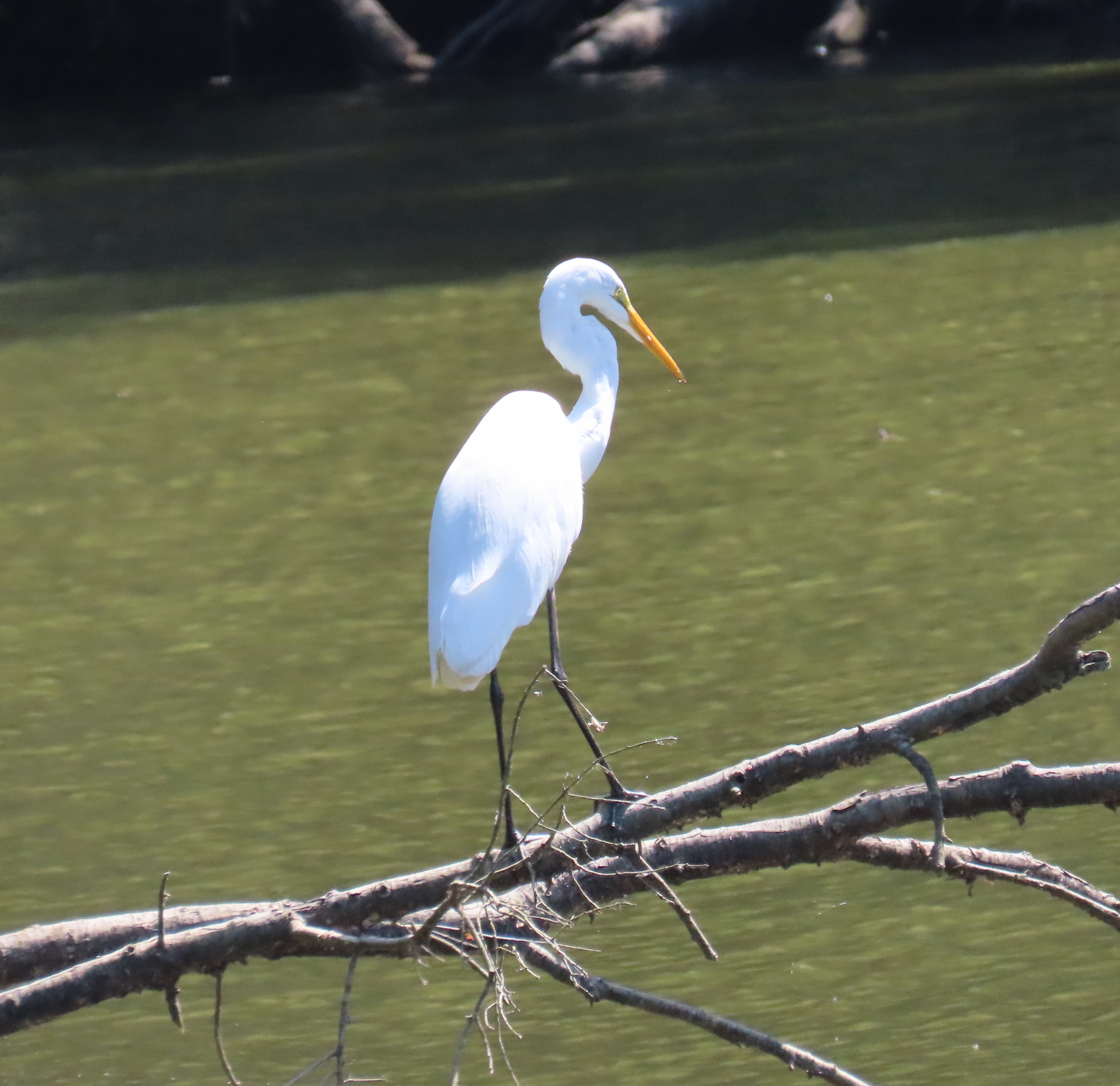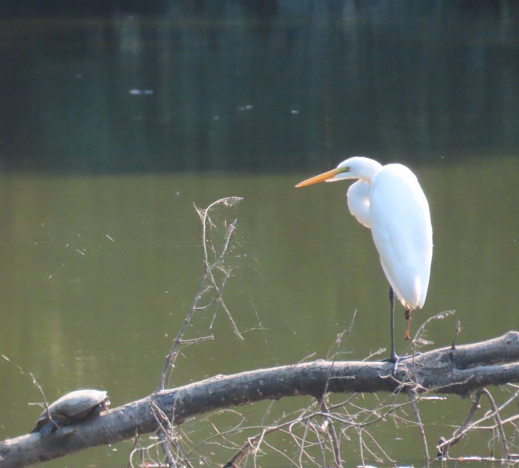 On the same day I saw the Bald Eagles (in the same park) I saw this Great Egret hunting from a branch over the water. It was only when I looked closely at the picture later I noticed the turtle a few feet to its left on the same branch: