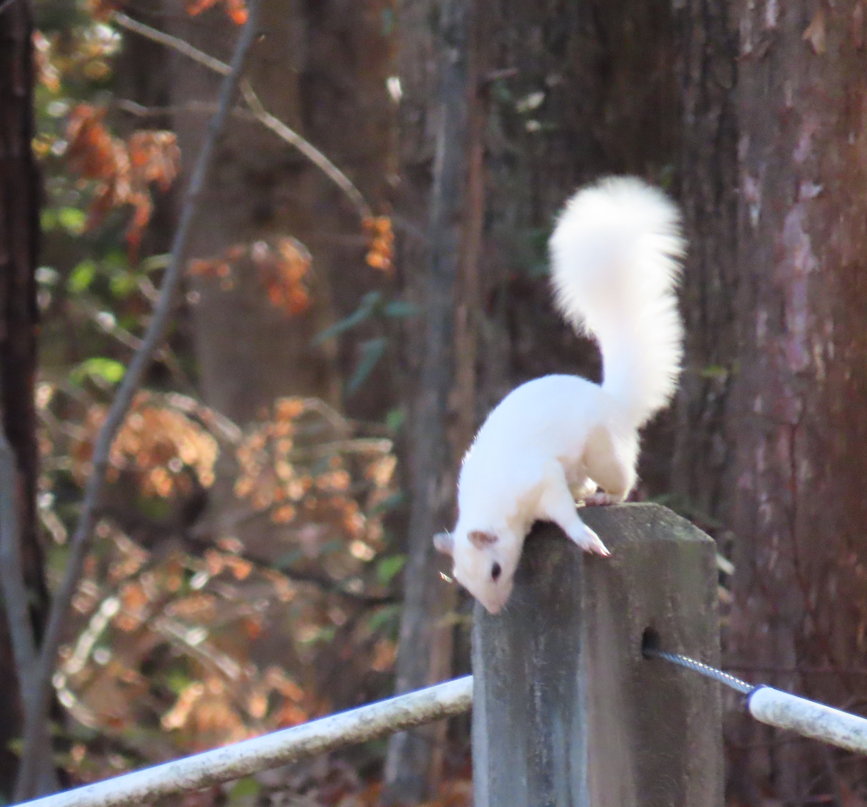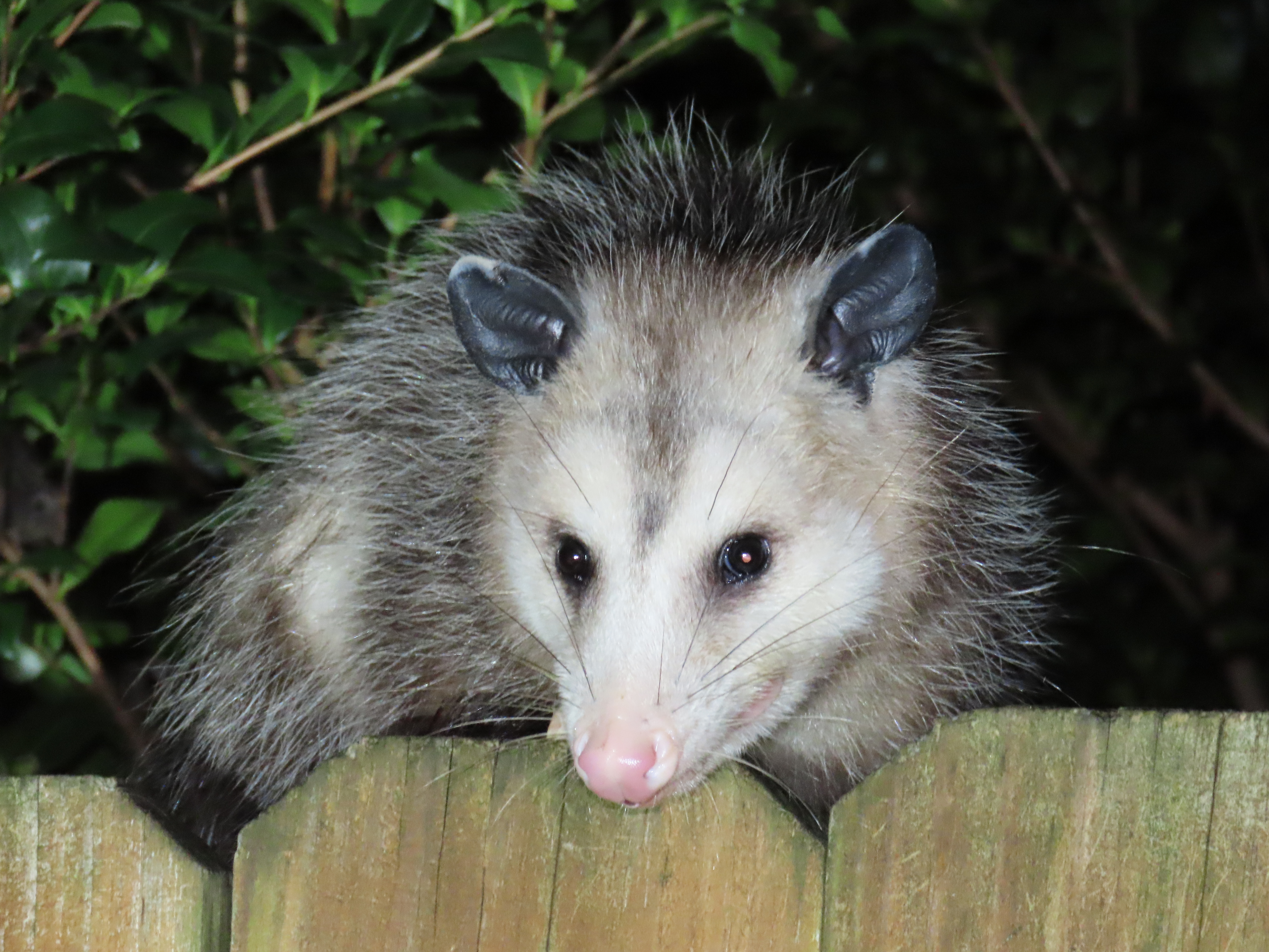 I nearly forgot – I got a surprise picture Thursday evening – in our backyard! Turner and I were getting ready for our evening walk when he sprinted to the back garden. I suspect this Virginia opossum (Didelphis virginiana) climbed (as quickly as possible) one of our back trees to reach the top of this fence: