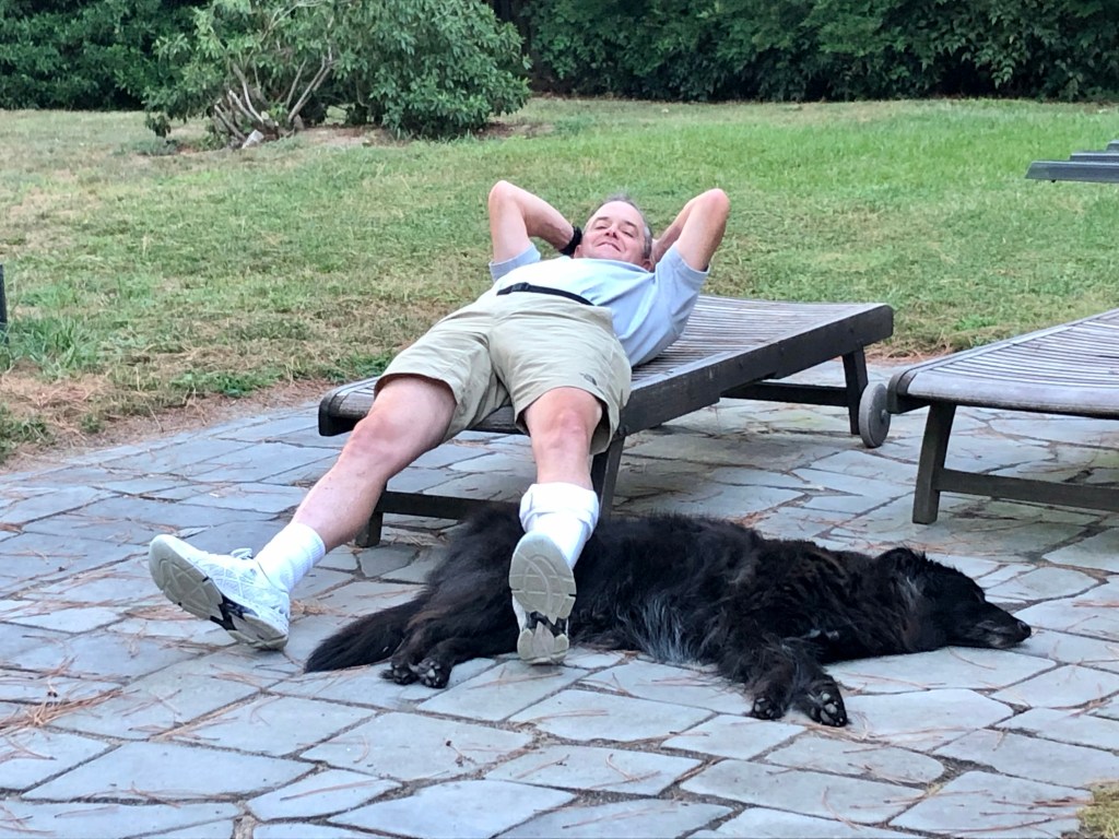 Two days later Evelyn and I each went to work in the morning. That afternoon we came home and loaded Mackey in the car and the three of us drove up to our vet’s office. Behind their office is a grassy, shady space surrounded by the building on one side and woods on the other sides, and they brought a blanket out for Mackey and Evelyn and the vet and me to sit on. It was the right thing and the best thing and I know my parents would understand that I felt even worse than when they died.