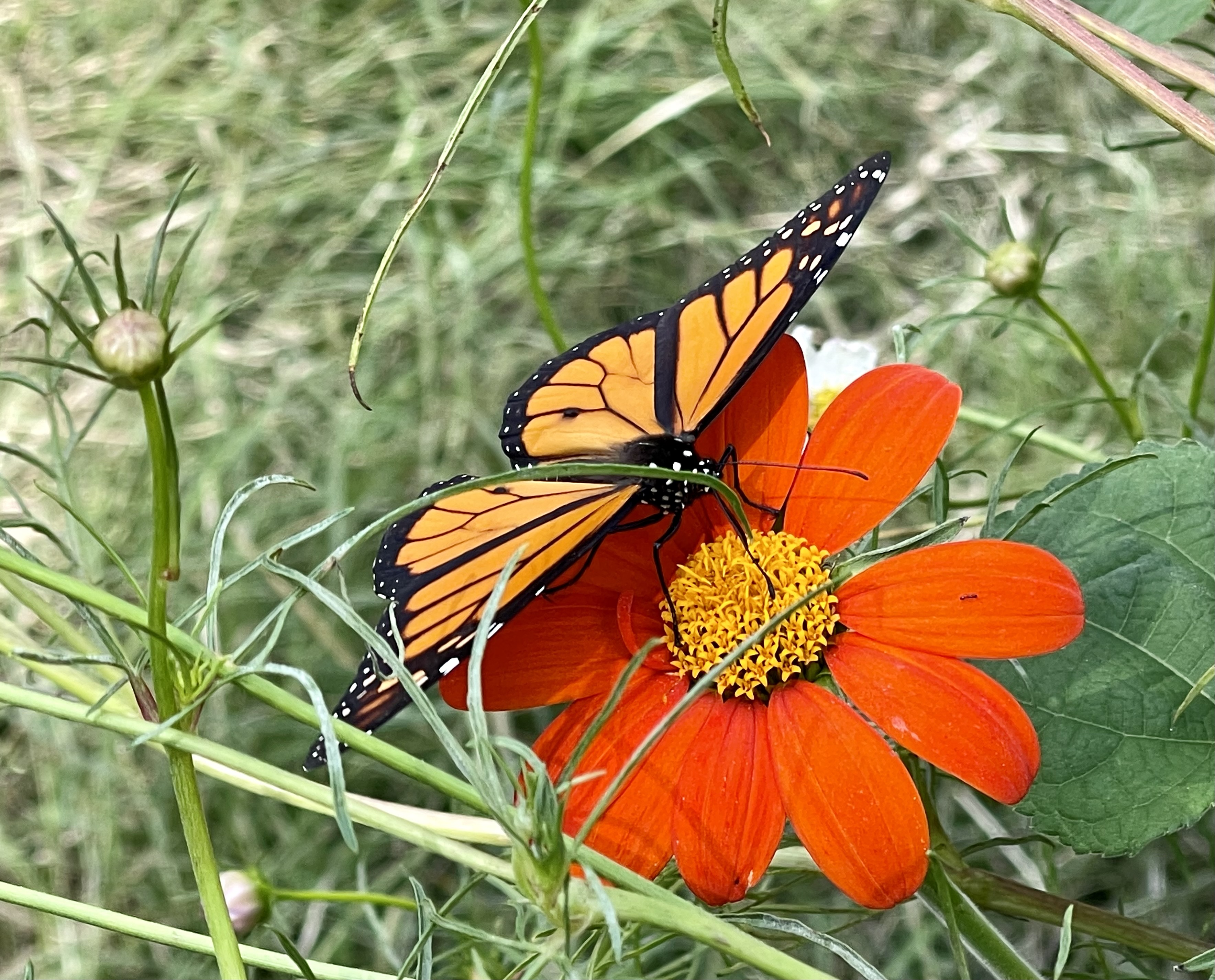 Evelyn and I visited the Uptown Community Garden at 2201 Parkwood Avenue last weekend. It backs up to the Downtown Expressway between Addison Street and Shields Avenue. The sign says “No Pesticides or Herbicides Allowed” and there are butterflies (and flowers and vegetables) everywhere. We don’t use pesticides or herbicides either, but we don’t have quite their population of butterflies. Here is a Monarch we saw there: