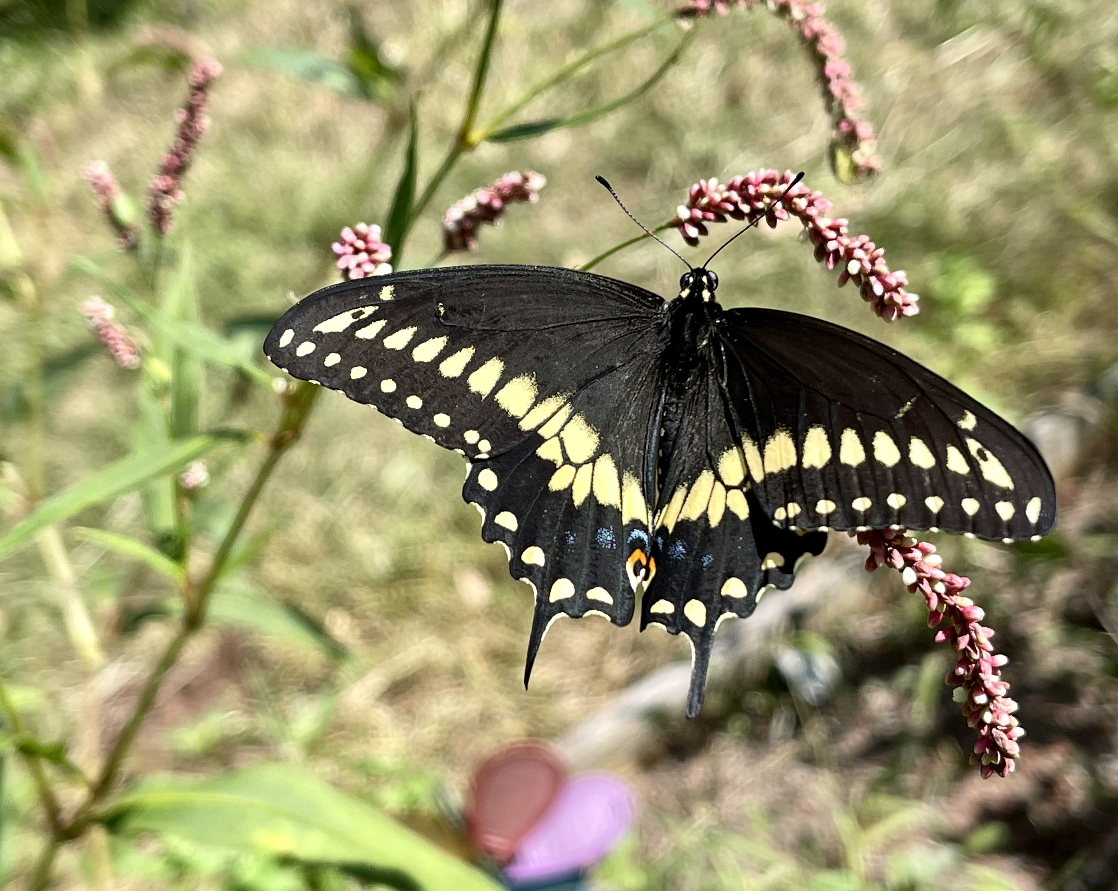 We saw a Black Swallowtail a few plants over the same day. I have tentatively identified this as a male; I am open to correction if someone points it out. Whichever gender it is, this is a nice looking insect: