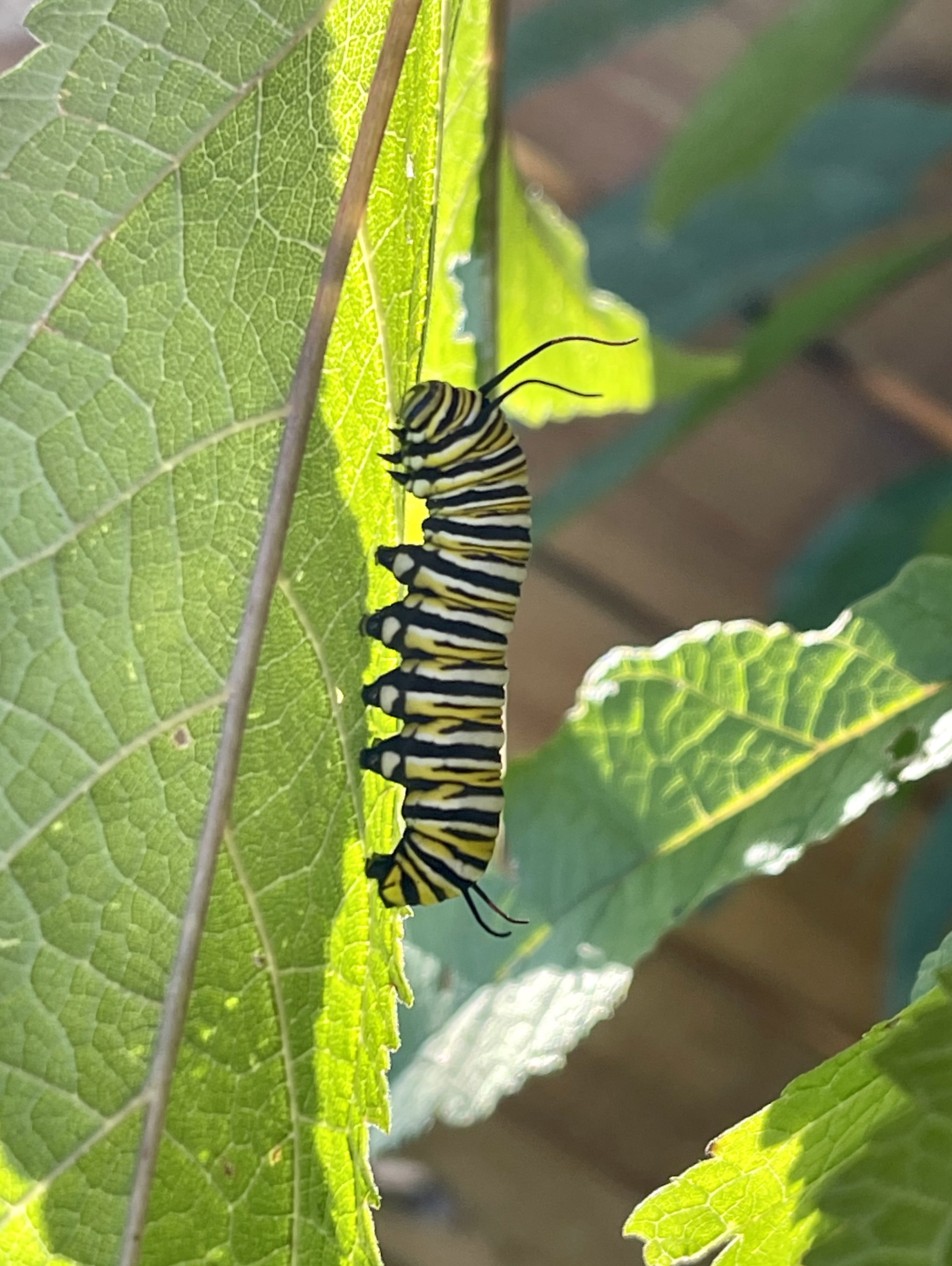 Also speaking of butterflies (indirectly), we have Monarch Butterfly caterpillars in our front and backyard garden. Monarch butterflies begin their lives as eggs; I didn’t see the eggs this year. Caterpillar (shown here) is the second stage of their life cycle. If they’re lucky (and if we’re lucky) they’ll form a pupa (chrysalis). A few formed on our front bushes last October. Some of them didn’t develop past that stage – nothing came out of the chrysalis. But a few reached the final stage and we “fledged” at least a couple of butterflies, the fourth and final stage. I hope we end up in a few weeks with actual butterflies, but at the moment we have caterpillars. They’re pretty!:
