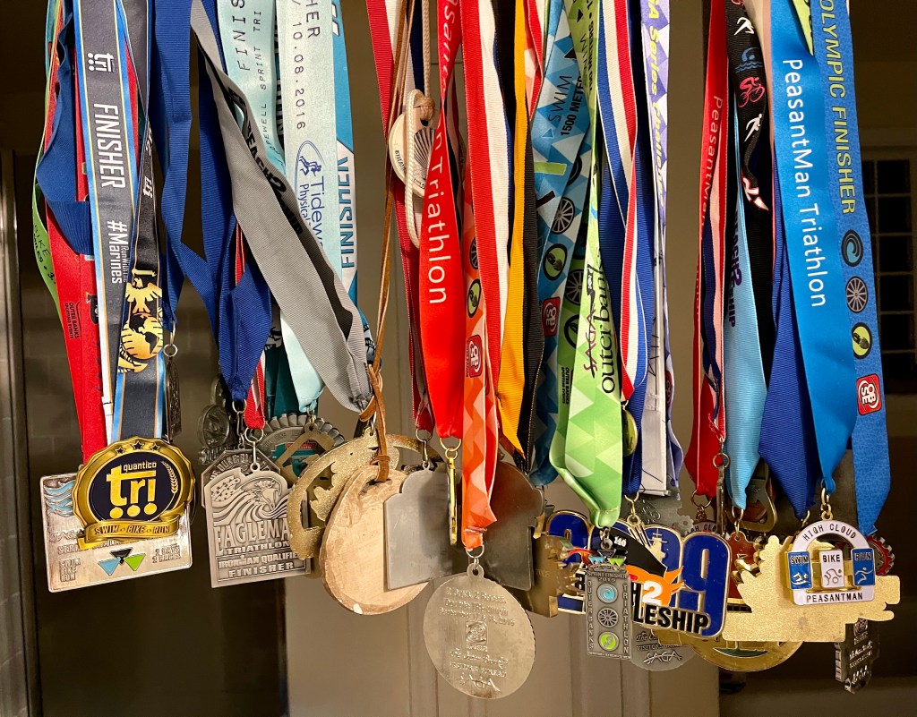 34 years of finisher’s medals. I train and race so I can eat ice cream.