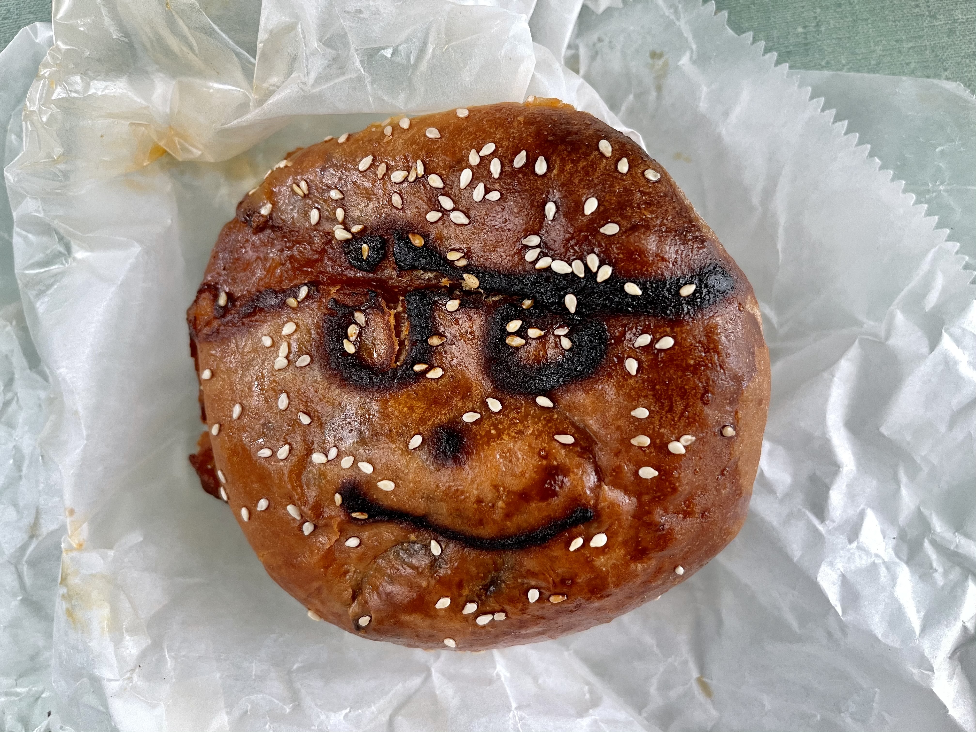I’ve mentioned Surrounding Counties in a previous blog post – Oxtail kolache from back in May. Their real specialty (in my opinion) is providing warm-hearted and friendly service in an excellent easygoing spot for coffee and food and other delicious treats. But what truly sets them apart is their kolaches. If you’re unaware (I was unaware), wikipedia describes kolaches as “a type of sweet pastry that holds a portion of fruit surrounded by puffy dough.” They sometimes have sweet kolaches at Surrounding Counties but more often – much more often – they have savory kolaches. Pulled pork, sausage egg and cheese, chili egg and cheese, and many more, plus what seems like an infinite variety of vegan and vegetarian options. They’re wildly creative and when I visited recently I was even able to get one wearing glasses! And it was delicious! Like looking in a mirror: