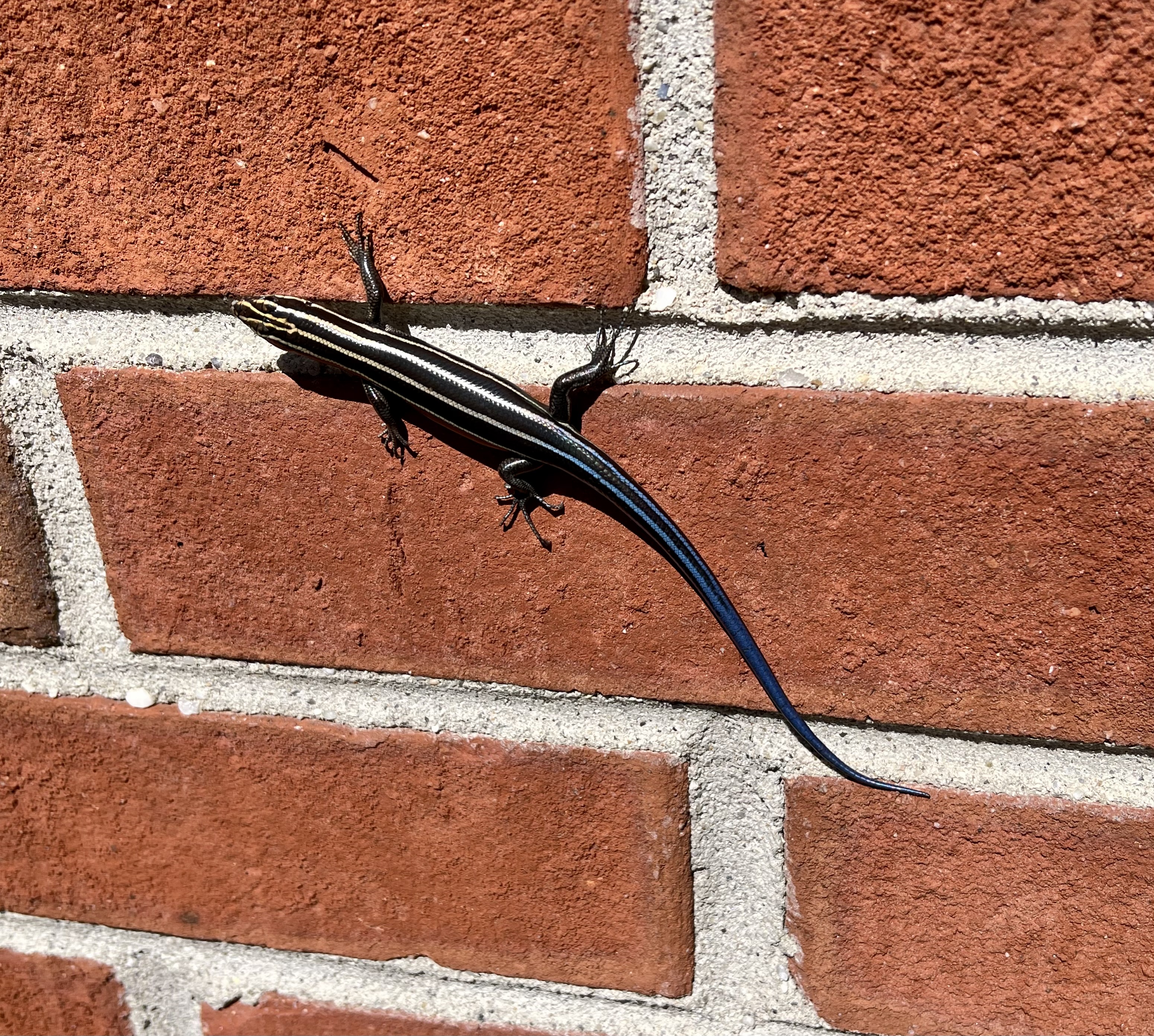 The sun was warming the bricks on the wall beside our driveway last week and this skink decided it was a good place to warm up: