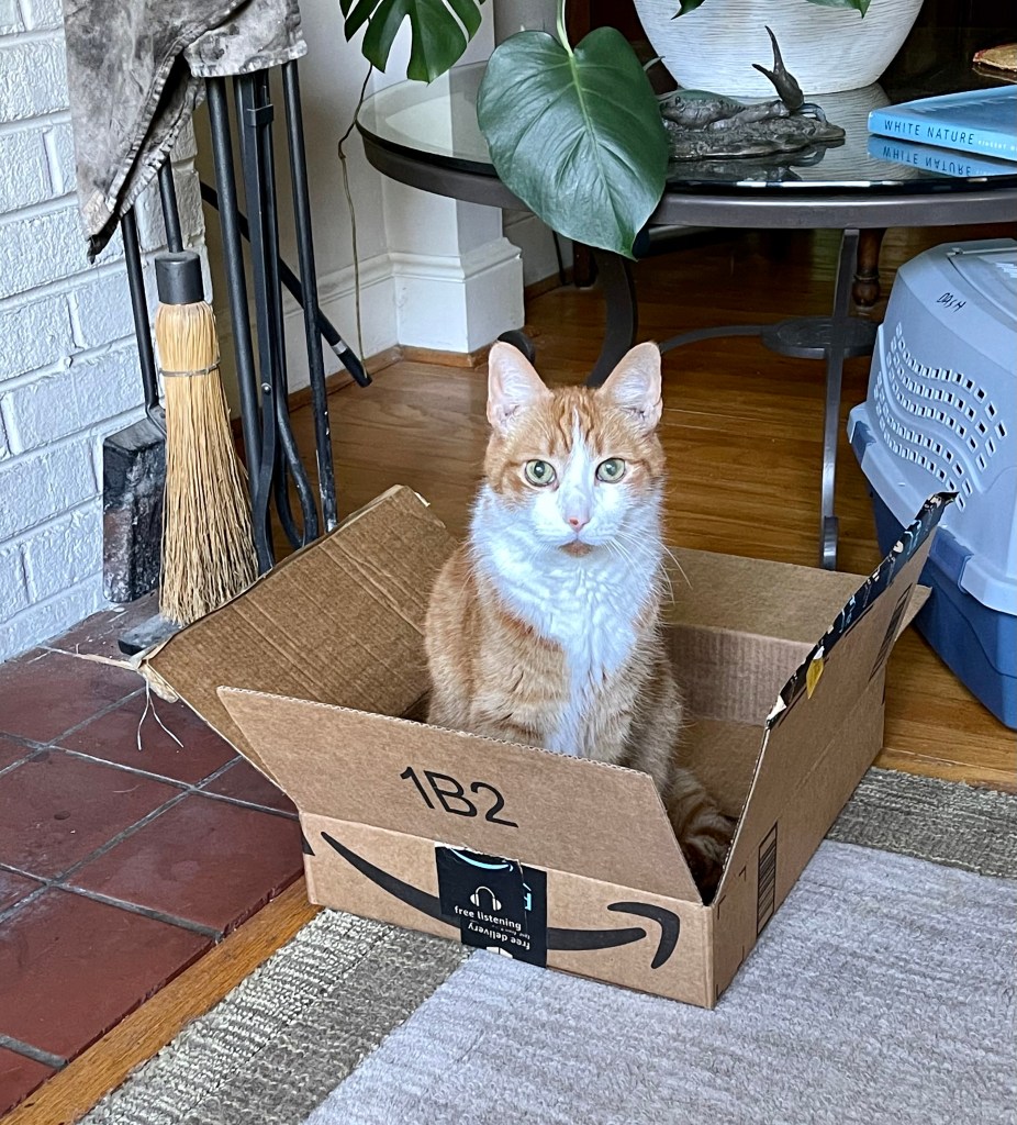A skink made it into the house recently; if Dash hadn’t been on the lookout it might have escaped alive. Now Dash likes to wait by the front door to see if any more crawl in. But he’s unable to resist the smell of cardboard: