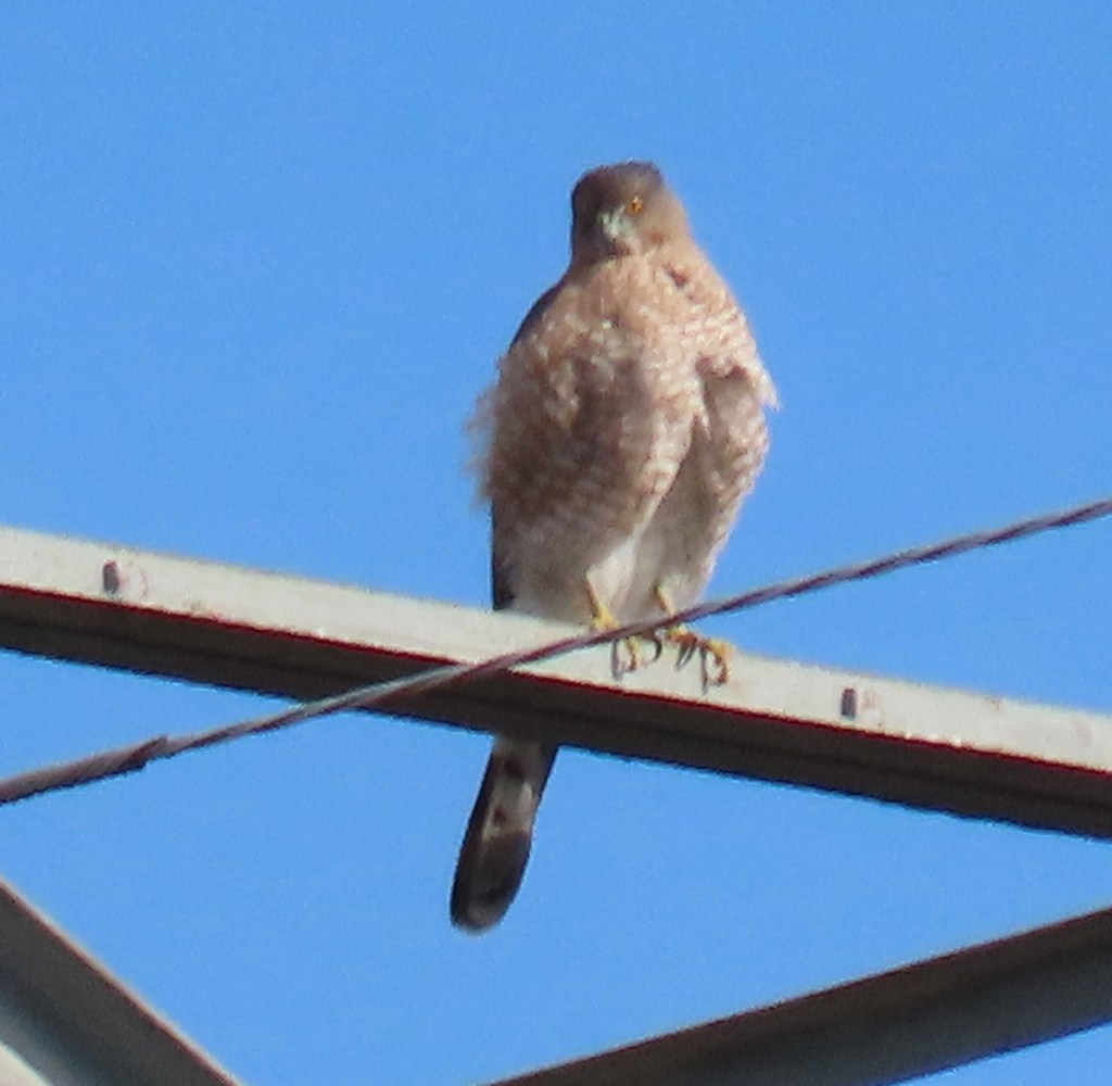 Also, since I’m (somewhat incessantly) on the raptor theme, I came home less than a week after my last blog post to see this Cooper’s hawk (Accipiter cooperii) perched casually on a branch across the street from my house, brazenly keeping watch on my bird feeders. When I say “bird feeders” I mean feeding songbirds, but hawks are birds too and I suppose this one thought it would come feed. Yikes. They sure are good looking birds though:
