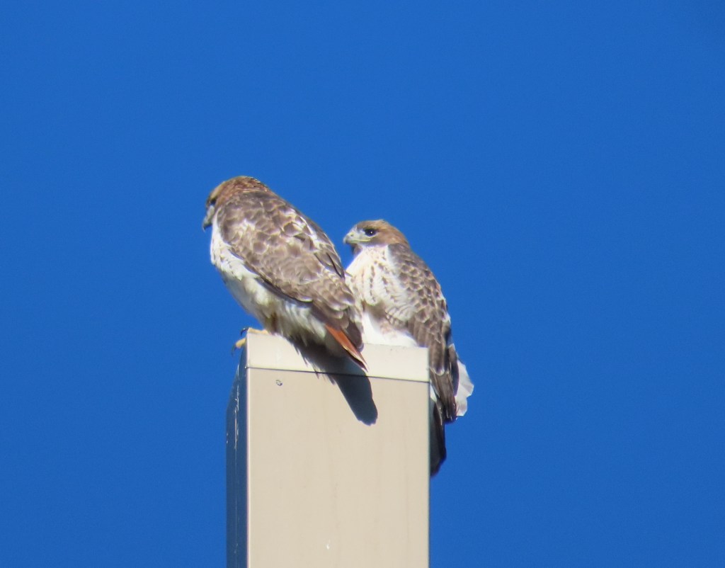 Pair of red-tailed hawks basking in the early winter sun. Male is on the left; he’s a bit smaller:
