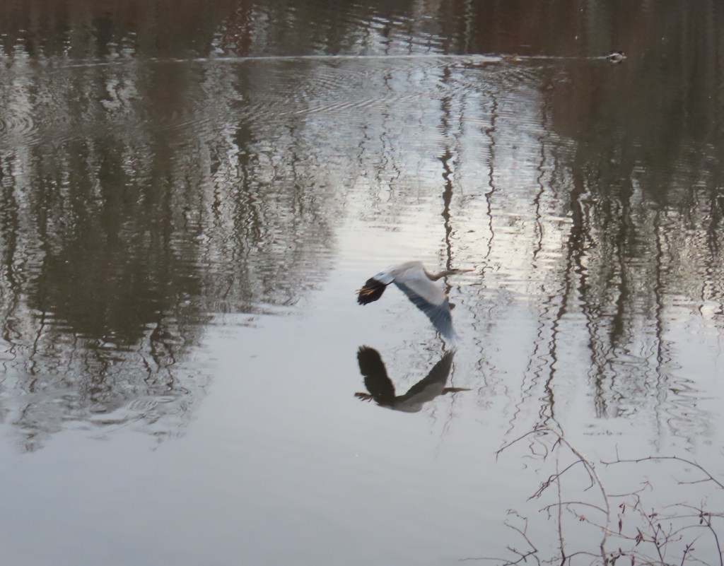 Great Blue Heron flying at Echo Lake; mallard pair swimming in upper right: