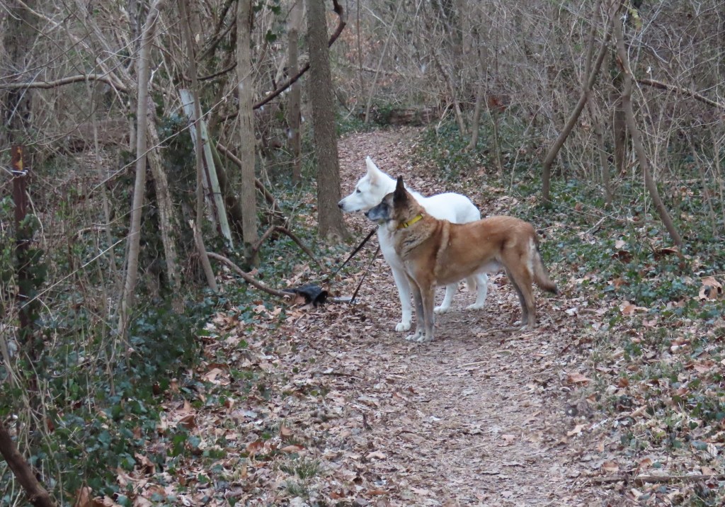 Yuki and Turner observing closely. Their leashes are tied around the fence: