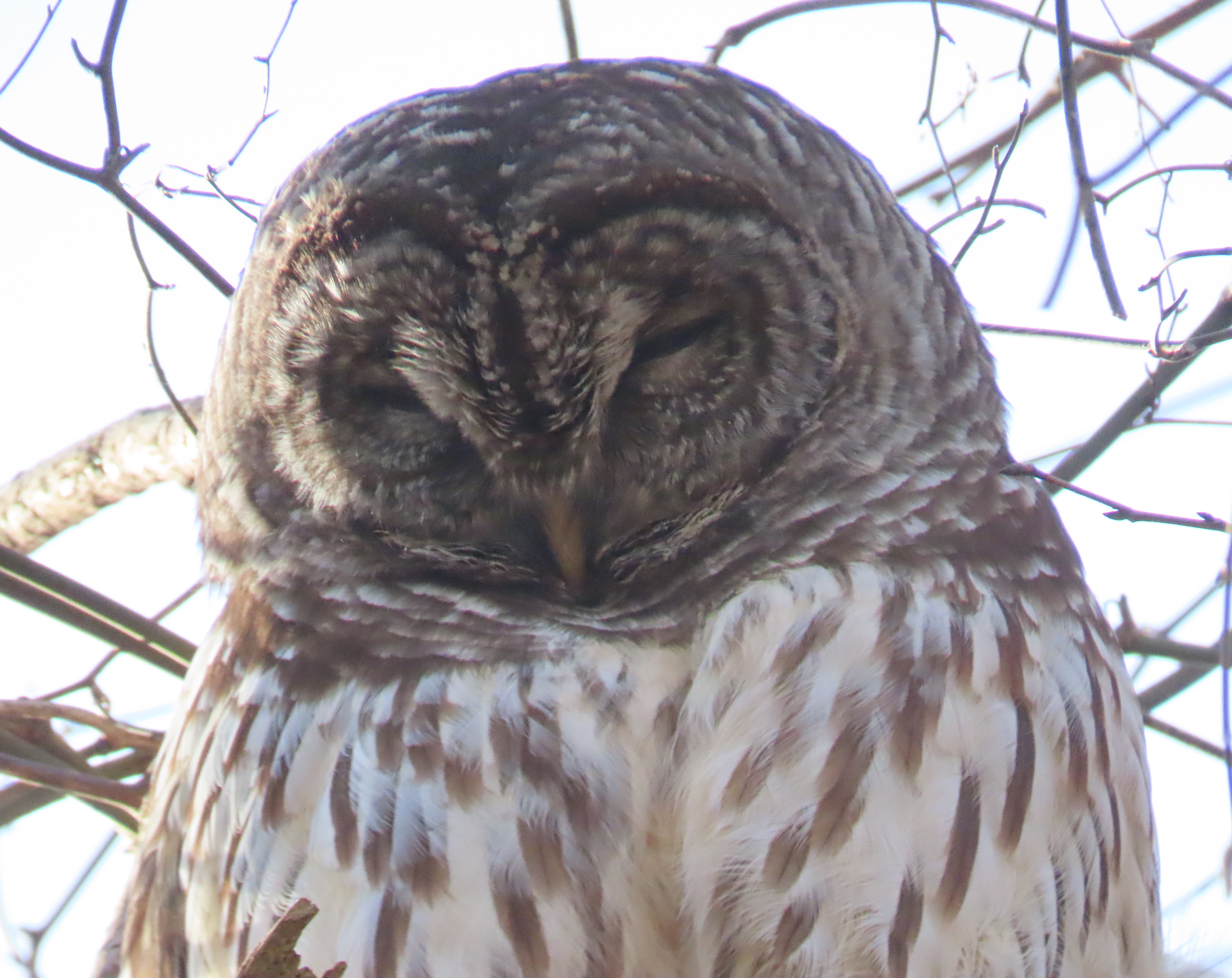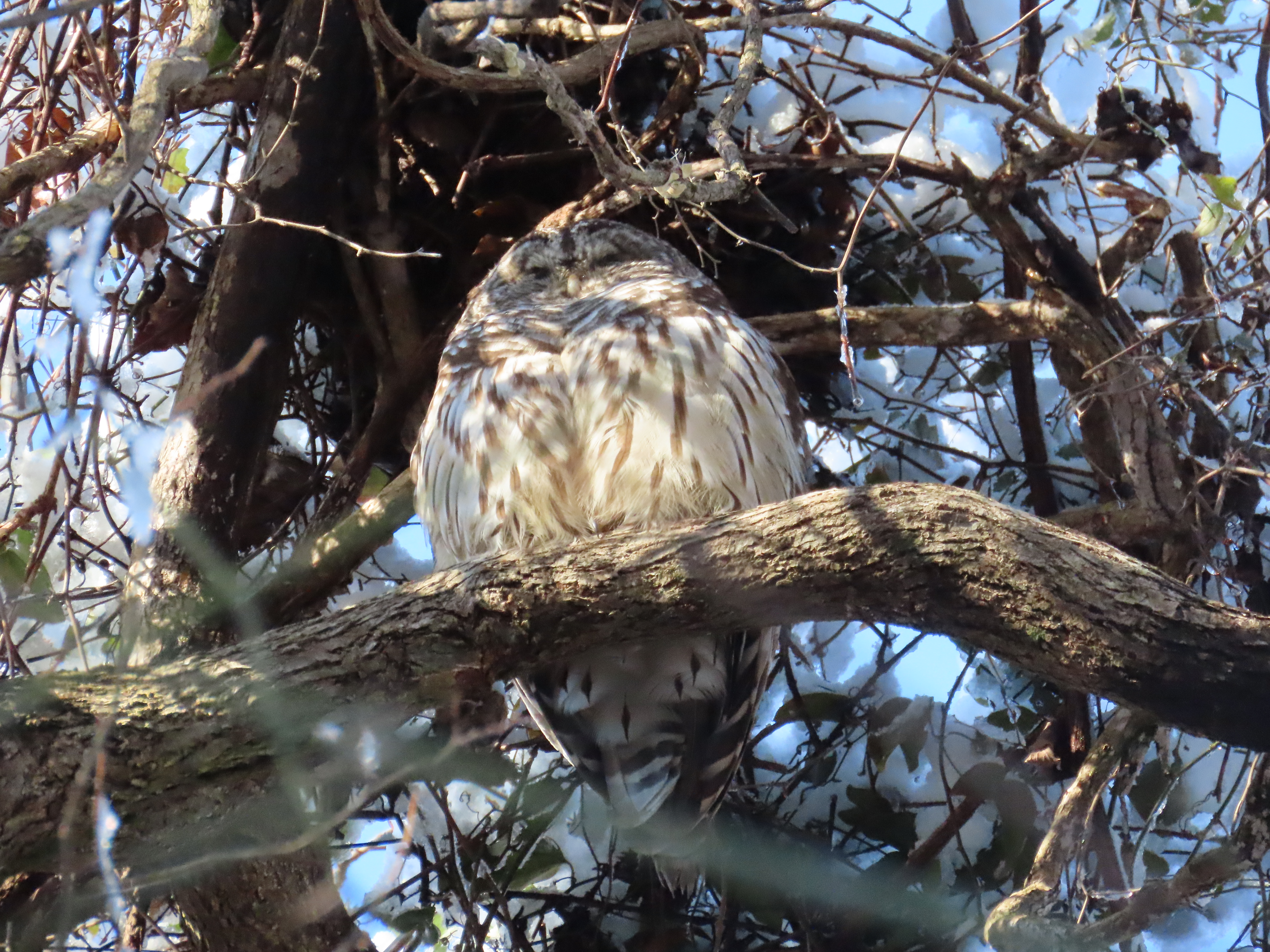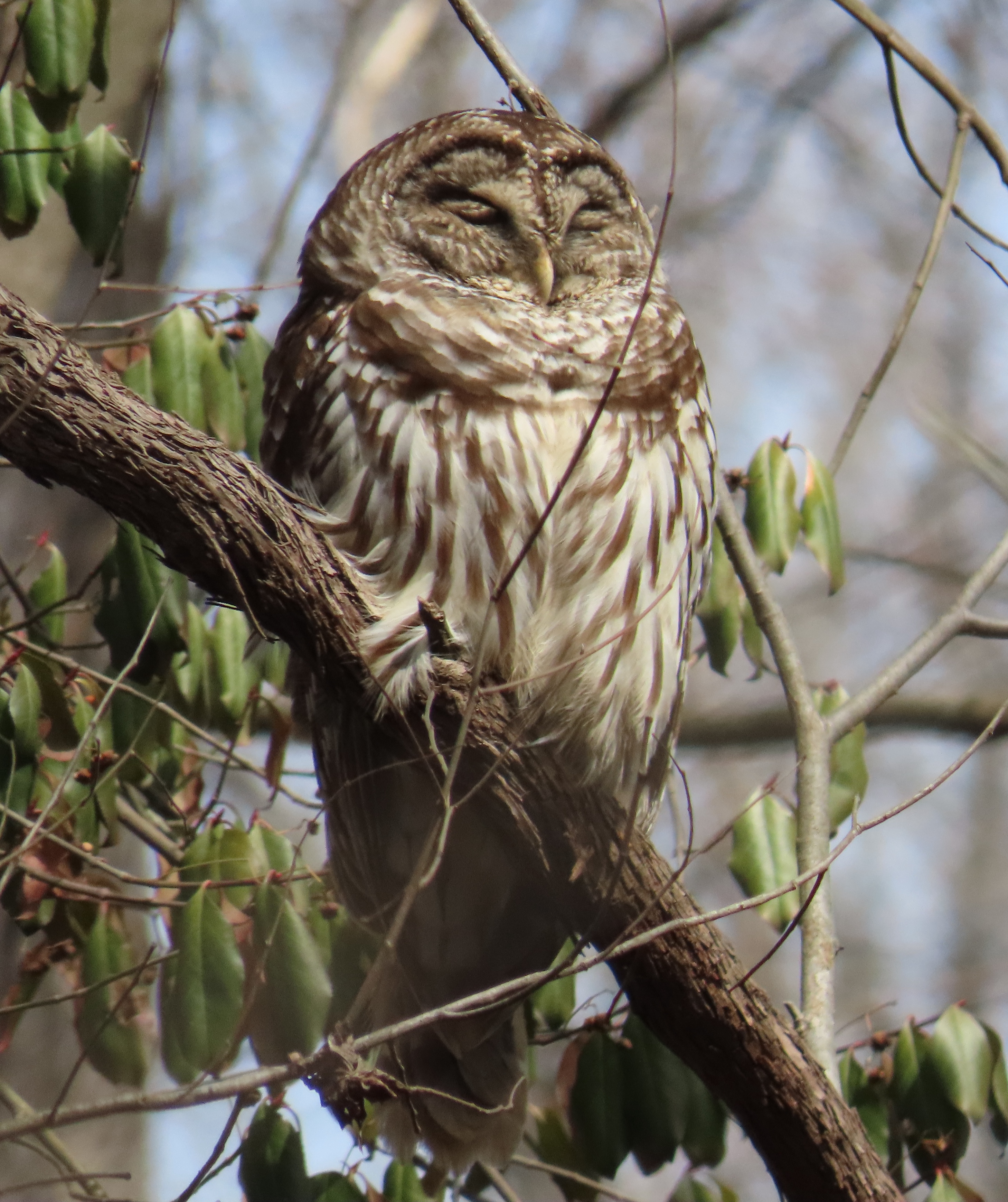 I heard Barred owls this morning at Pony Pasture – I heard a pair calling back and forth – but I never saw them, and so was never able to put a lens on them. But I have seen a lot of Barred owls there in the six weeks since my last post. I even got a picture of a pair, but they were shrouded in dead vines and I didn’t enjoy the picture. Here’s one I took in late January:
