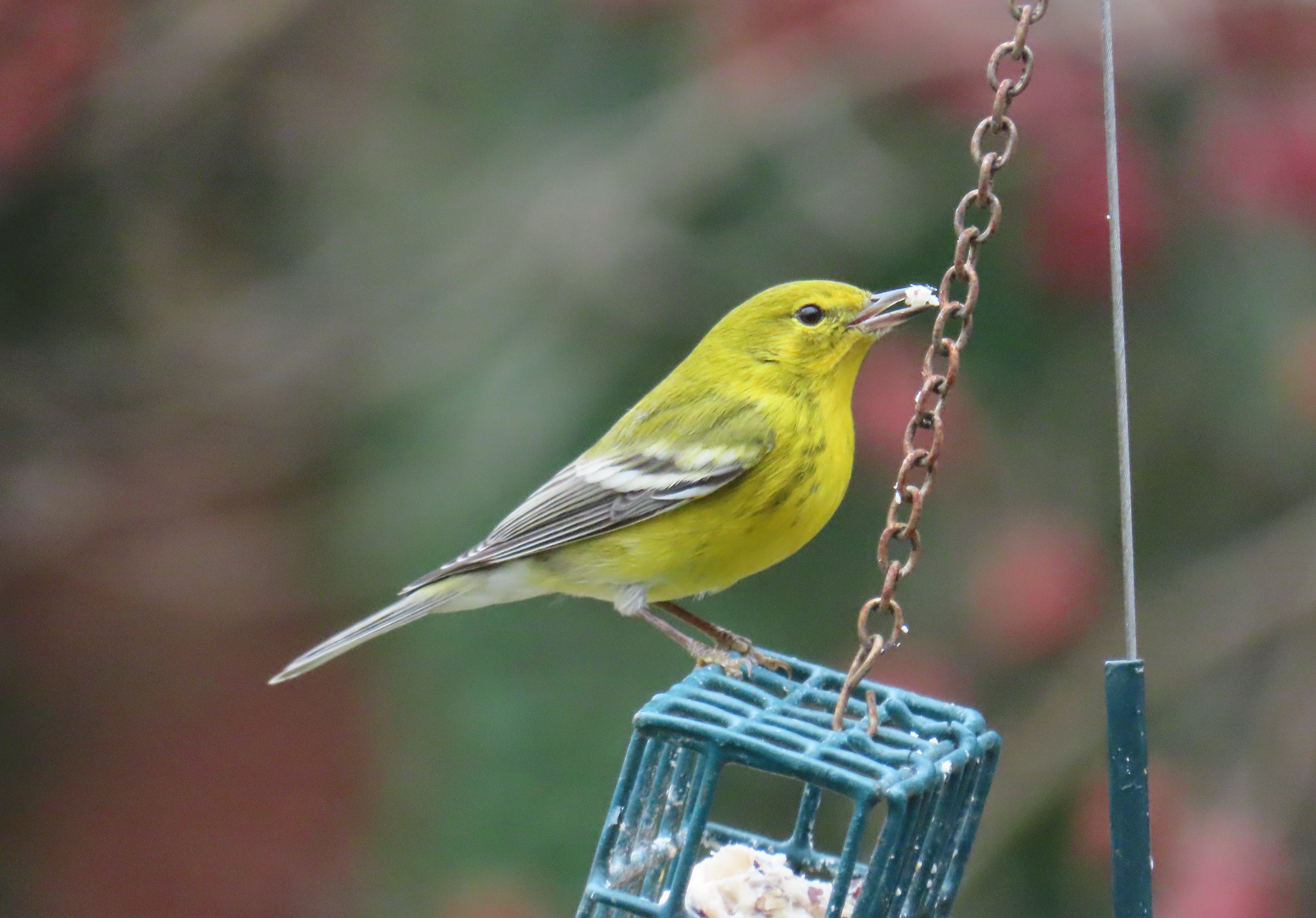 Adult male Pine Warbler with a piece of suet in his mouth, first day of winter, 2021 (12/21)