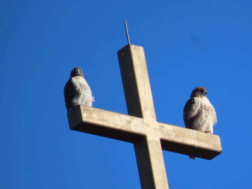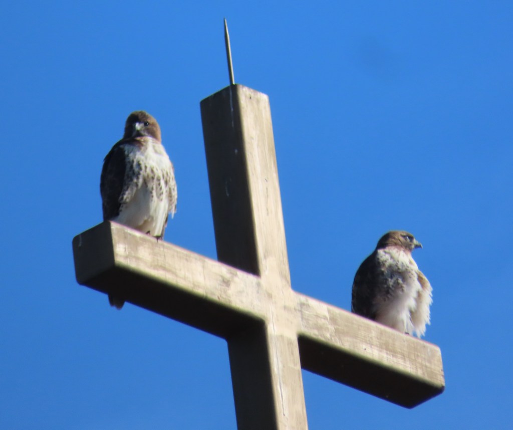 Speaking of owls (more precisely speaking of raptors) I saw (again) a pair or Red-tails on the same cross at the same church. Scroll down and compare this with the one from the last post; same cross, certainly the same hawks, just different poses. I presume soon they’ll be feeding babies. This is just from eleven days ago: