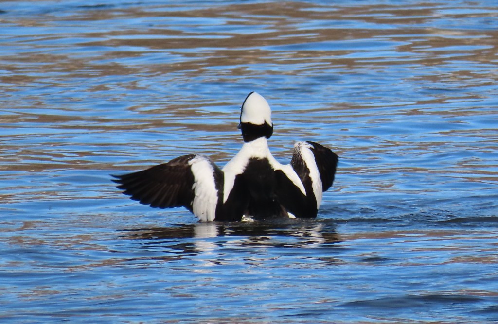 I first started hiking at Pony Pasture in about 1990, when my old friends Marni and Jason lived here. They introduced me to it and although they’re in Oregon now, I’m still at Pony Pasture regularly – even this morning! So I’ve been hiking there well north of three decades, and I recall seeing my first Bufflehead (Bucephala albeola). I know it was a female because I distinctly recall looking at her and thinking “that looks exactly like a Nike Swoosh.” I was so ignorant in those days (compared with how ignorant I am in these days) that I had no idea what I was looking at. I was fortunate that the inimitable Betsy Slade enlightened me. That was probably in the winter of 1990 – they’re strictly winter ducks – and I saw her about a month ago and she is in every way unchanged. The flocks of Buffleheads on the river look just like they did in 1990 as well. They arrive here around the first frost (typically late October) and head back up north around the last frost (mid-April). Anyway, there were big flocks there this morning but I photographed this male in the fourth week of January. This is from behind, and I suspect he was showing off for a female, or just trying to show how much more fit he was than the other males in the flock:
