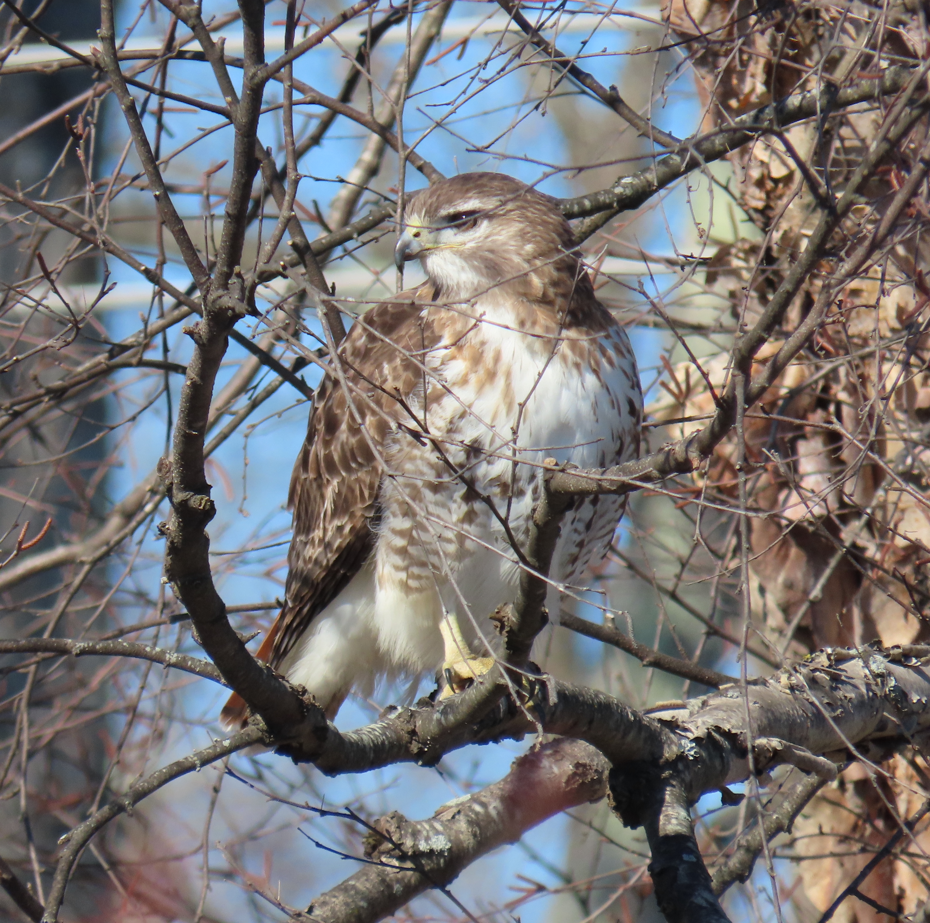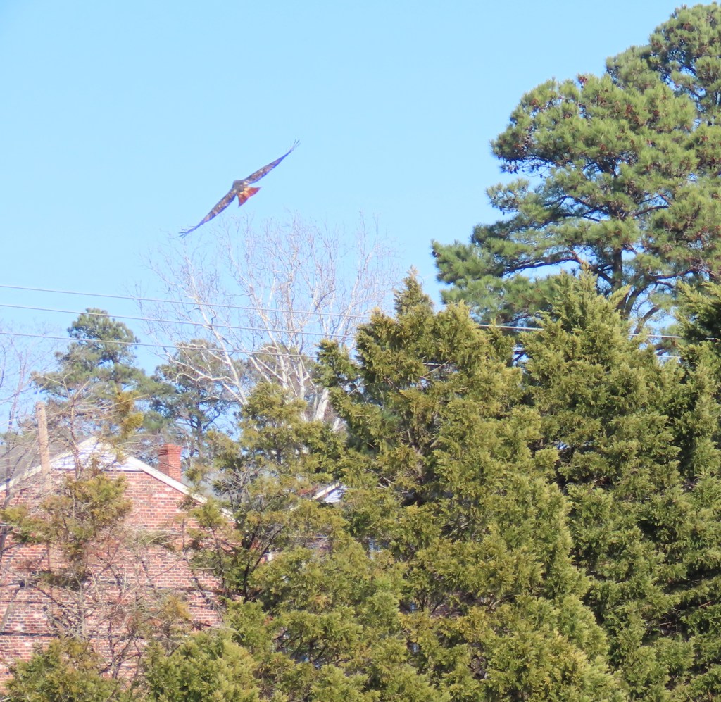 I was standing in front of the Y a couple of days before I took that picture of Dash yawning. I was talking with my old friend Tom, who’s worked at the Y almost as long as I’ve been a member – possibly longer. Tom also enjoys hawks as much as I do, and while we were standing there a big Red-tail (it had to be a female; they’re much larger than males) swooped into the tree in the northwest corner of the parking lot. I went to my car and grabbed my camera and snapped a quick picture. If they’ve eaten they’ll sit around for a while but she was still on the hunt. I managed to get up sun from her and get one quick picture before she departed in search of a snack. Here she is a moment before she took off:
