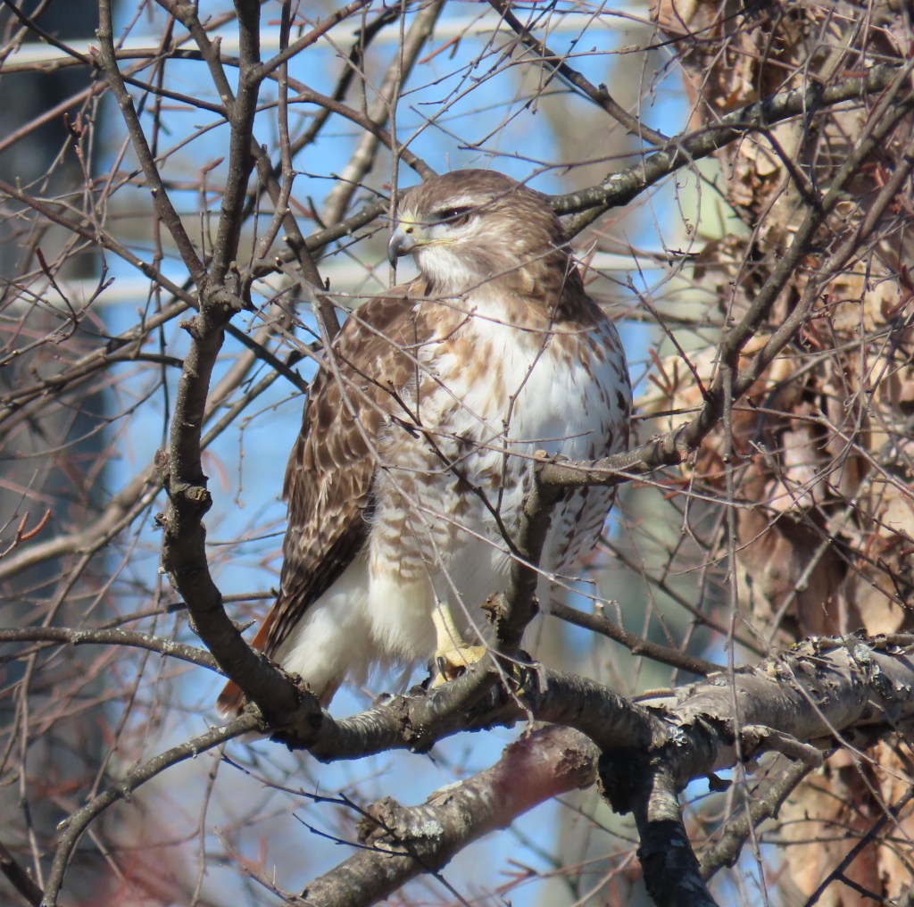 Red-shouldered hawk perched on a Tulip poplar branch. Foot under its feathers because it was cold.