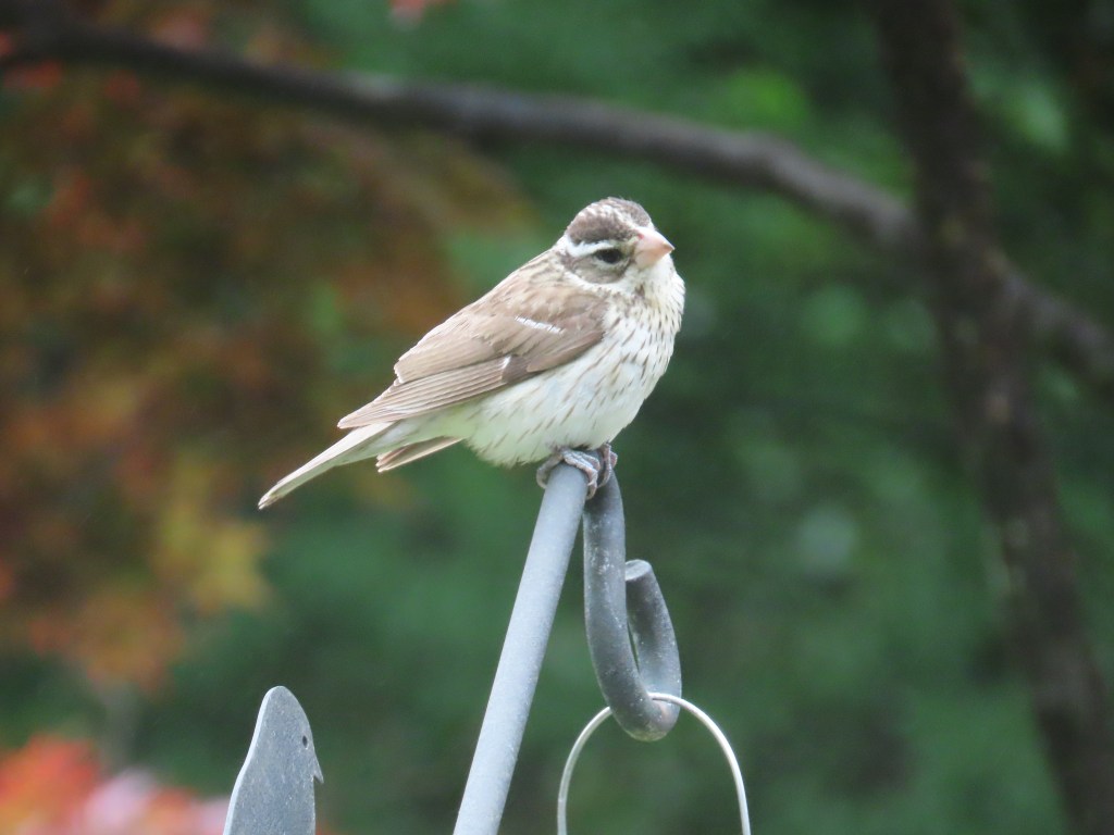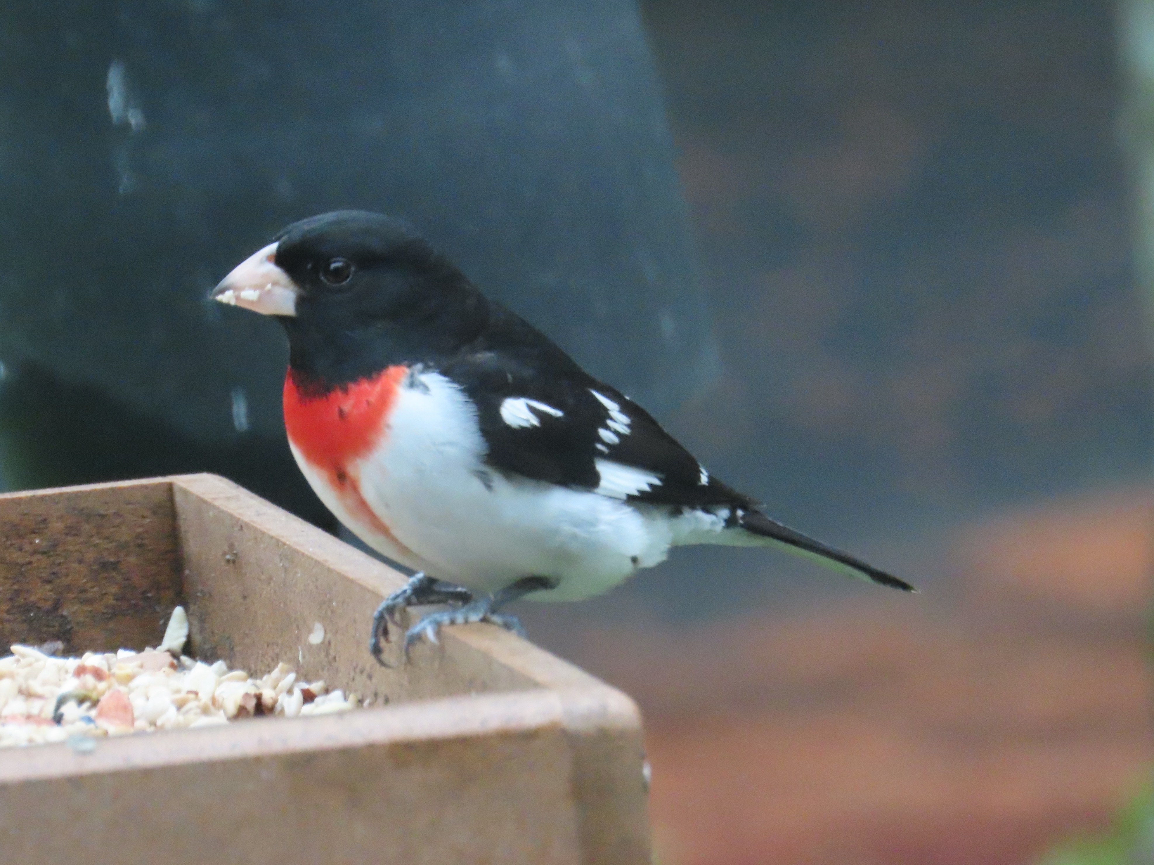 I saw Rose-breasted Grosbeaks (Pheucticus ludovicianus) on my feeders today – always a treat in the Spring. Also, I’ll put a picture of the male first. Then I saw a female – and I thought it was some sort of sparrow or finch I’d not yet ID’d. But I used Merlin Bird ID and it told me it was a female Rose-breasted Grosbeak. First the male then the female: