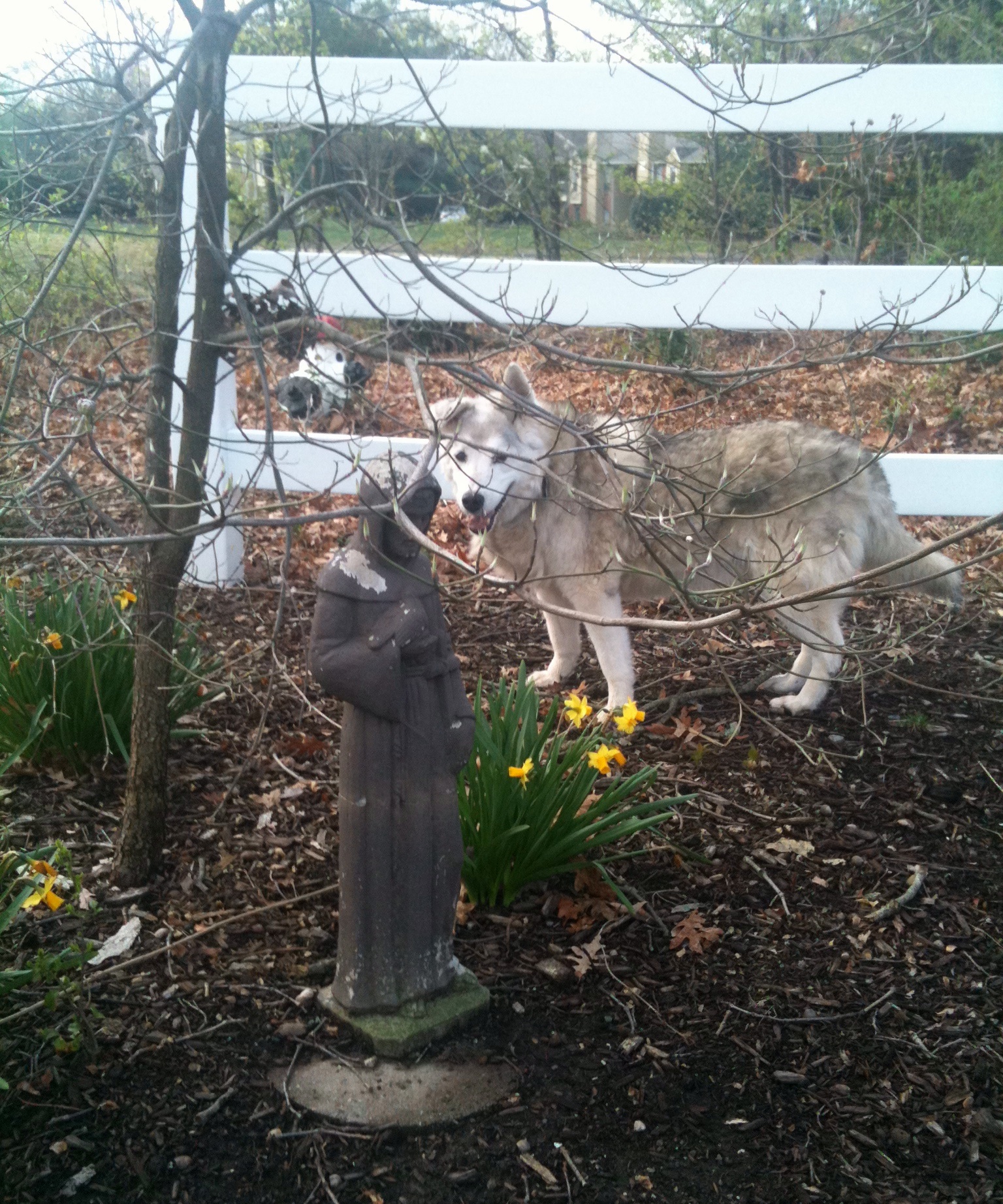 Ivory, St. Francis, daffodils – Spring, 2011, Springfield Veterinary Center