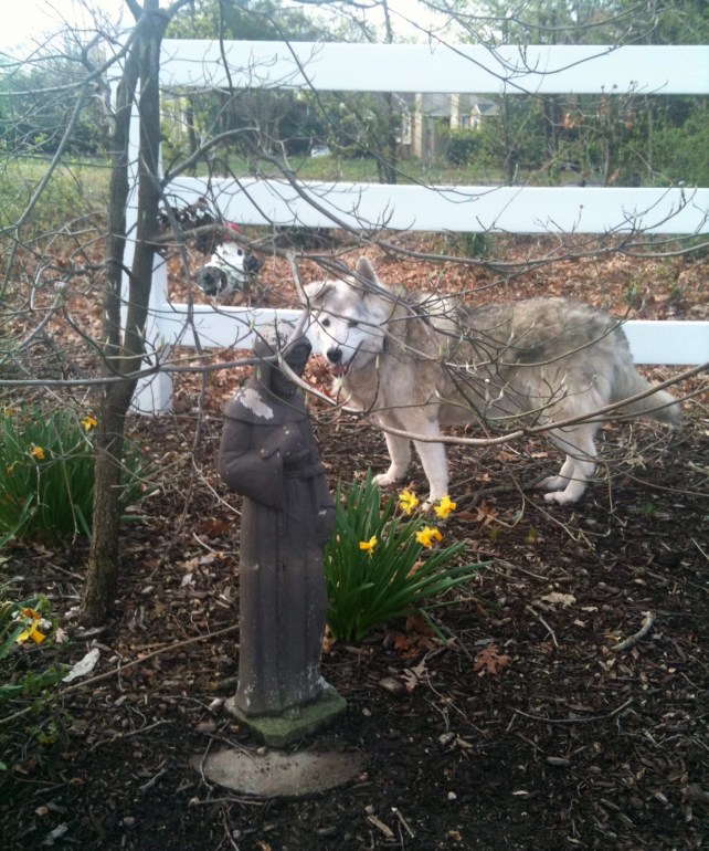 Outside the clinic there is a statue of St. Francis of Assisi, standing gracefully in a delicate patch of daffodils, beneath a small dogwood that will soon blossom. What a perfect spot for a Spring picture of my old buddy.