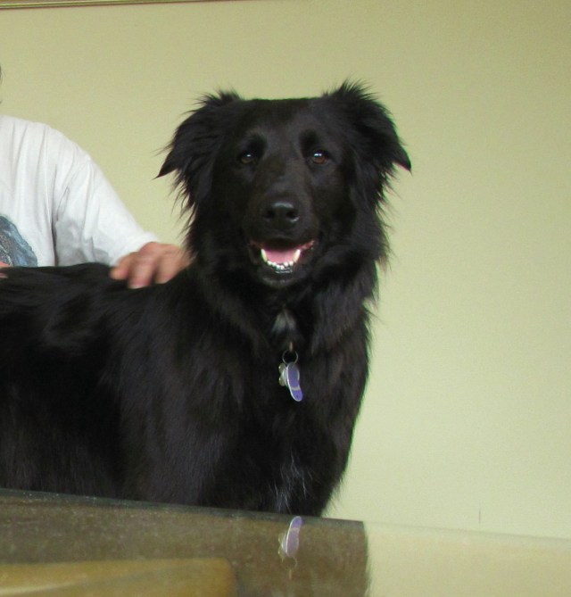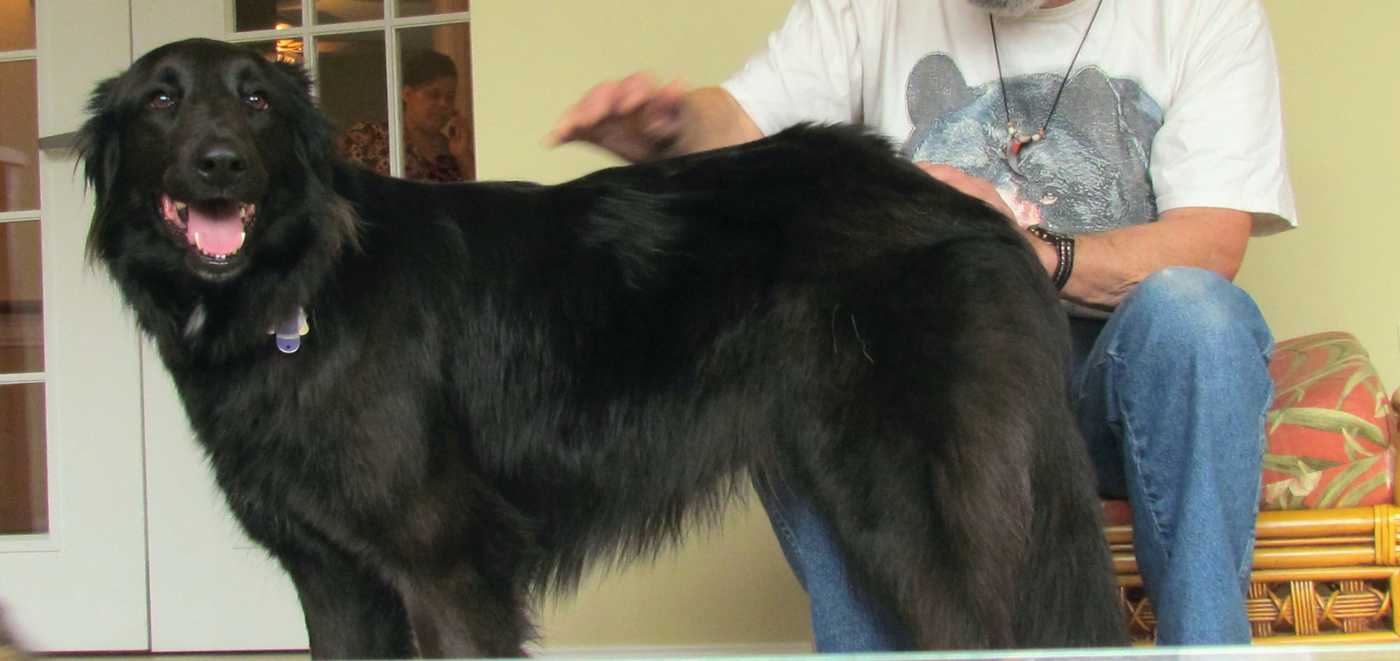 This is Mackey, a male Flat-Coated Retriever, approximately Roux’s age. They’ve grown up together. Mackey’s not as confident as Roux, but he was feeding off the calm energy of the room and he was quite calm himself.