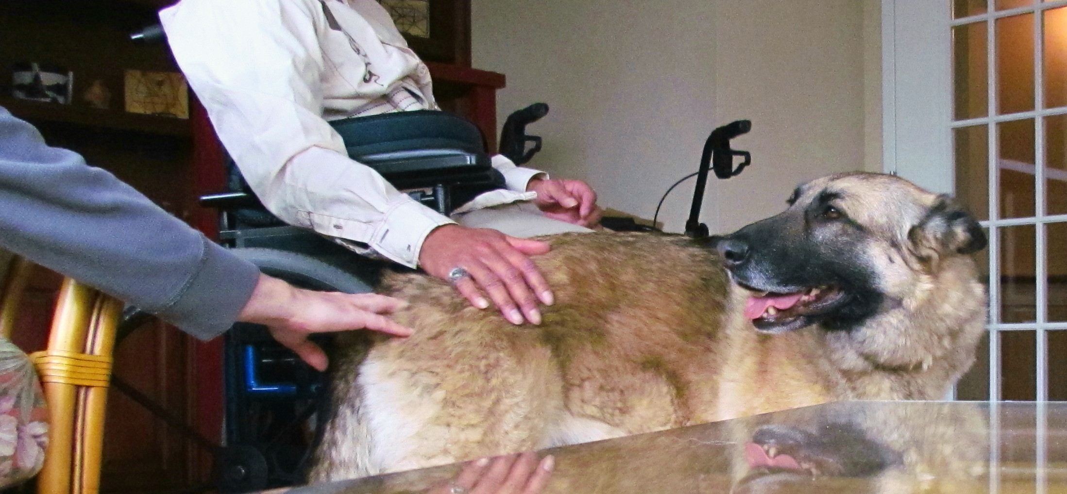 The image at the top of this page is of Roux, a female German Shepherd, maybe 4 y.o., great personality. That’s what happy, relaxed dogs look like. Can you see how she’s smiling? The energy in that room was very, very peaceful. Including me there were six adult males, two in wheelchairs, two with walkers. The guy with the white sleeve is a former Military Police officer and worked professionally with German Shepherds. He is confident and capable and Roux reflected this back. Healthy, well-adjusted dogs reflect our moods to a great degree.