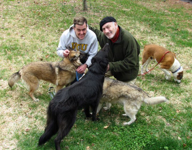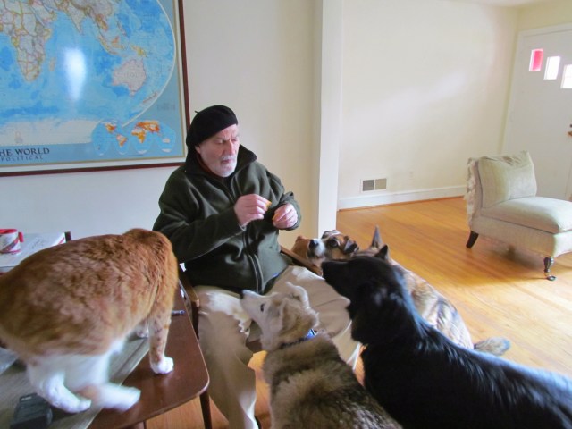 Next is Lou sharing cheese – a favorite food of virtually every canine – with my pack. By the looks on their faces you’d think they never ate. Even Dash (my orange cat) is coming over to find out what’s so interesting. They don’t act this way around me – even when I do have cheese. I think perhaps they’re more interested in Lou.
