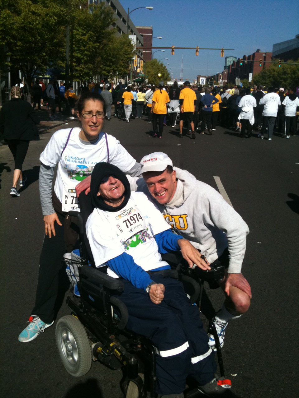 It seems unusual, even from my perspective, which I’m aware is often unusual to start. But Alex and I met my friend Ed and did the Monument Avenue 10K here in Richmond this morning. Which was, as I posted on my facebook page just before Mile 2, a “10,000 meter celebration.” And I mean that sincerely. From the moment Ed and Alex and I walked and rolled across the starting mats until the moment we crossed the finishing mats 10,000 meters – and 2+ hours and many, many, many great people and dogs later – it was a non stop celebration.