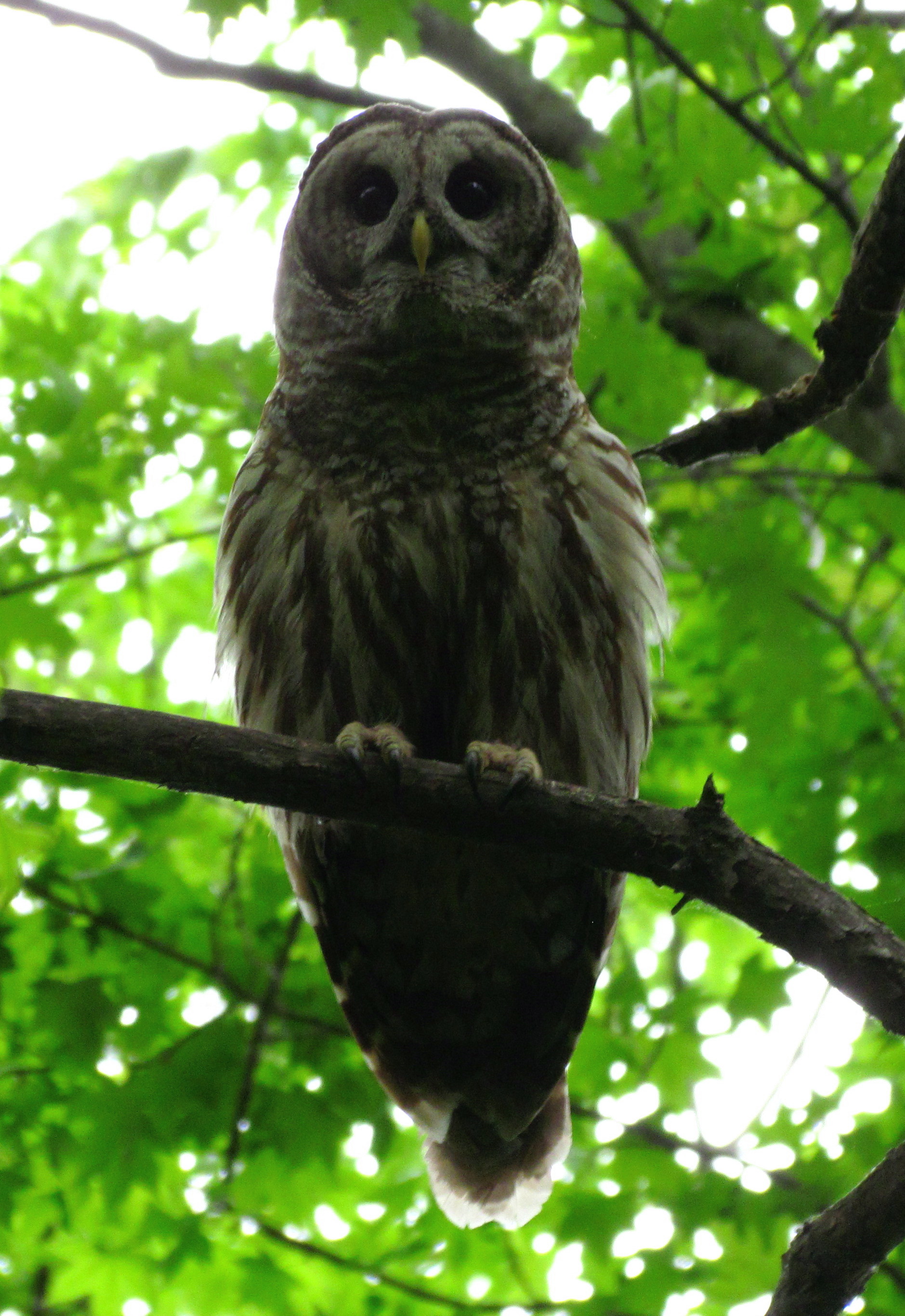 I’ve still got a few shots left for a future post – maybe I’ll put it up tomorrow. But this one is big enough for now. I’ll close with a picture I was fortunate to take at Pony Pasture near the end of April. My friend Lynda Richardson and my sister Katie identified this beauty as a Barred Owl (Strix varia). It was quite cooperative, stopped in a tree within sight of the parking lot at Pony Pasture on the last Thursday in April: