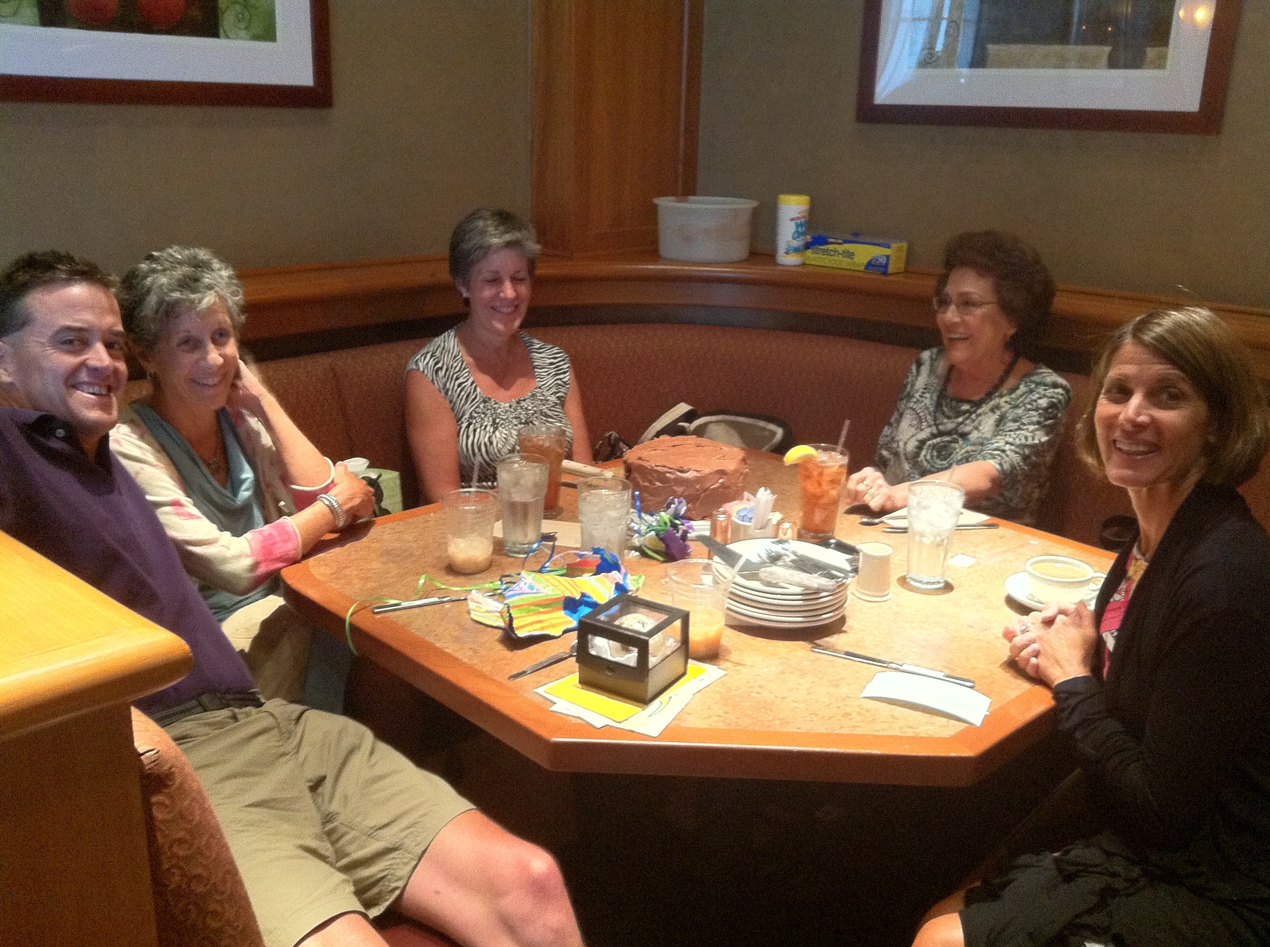 This is the crowd who helped me celebrate my birthday. Me on the left and Evelyn next to me. Sue is on Evelyn’s left; she made the cake. See it in front of her? Now it’s mostly inside of me. I almost finished the whole thing that evening. It fueled more training this week plus a special 50th Birthday Edition Appalachian Trail Hike and Campout with Mackey and Roux last night. Marcia is next; she’s the ringleader. Our raison d’etre. She started our whole lunch group a year or so ago. Thank goodness!  Jody (right) gave me the globe. That’s it in the little box in front of me. This picture was taken before the quake. Look at Jody’s face. Doesn’t it look like she knows something’s about to happen? I’ve known her a long time; she’s known for her unique gifts. A globe and an earthquake on the same day? Coincidence? I am so sure.
