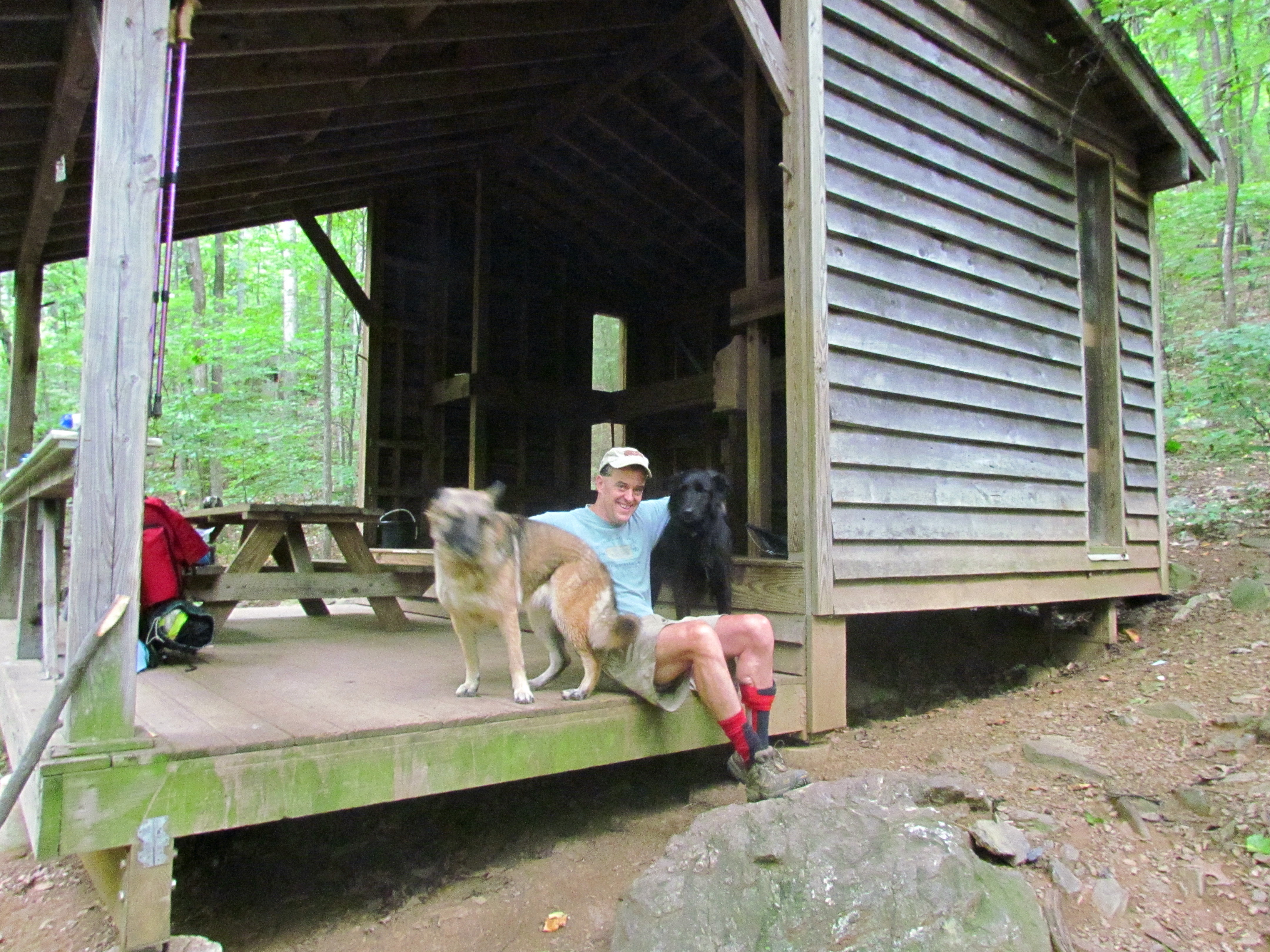 I have dozens of pictures from the campout; it deserves its own post. But here’s one from down at the shelter. There was only one person there; he took this just before he left. Roux was already wanting to be hiking!: