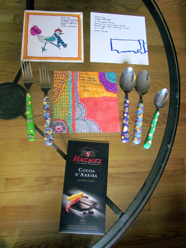 Look at those CARDS! Those FORKS and SPOONS! That CHOCOLATE!