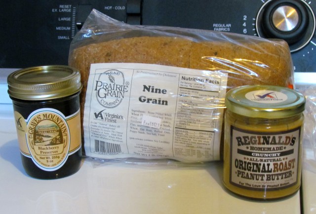 Another thing that’s been fueling my workouts – that’s always fueled my workouts – is delicious peanut butter and jelly sandwiches. On whole wheat toast. They are just so delicious. Evelyn raised the quality of the sandwiches this year when she gave me Reginald’s Home Made Crunchy All-Natural Original Roast Peanut Butter and my absolute favorite jelly, Graves Mountain Blackberry Preserves. Toast my favorite bread, Prairie Grain Bread Company Nine Grain Bread – all three products are made here in Virginia – and make a PB&J with those ingredients and you’ve got the best fuel going. Best tasting and most energizing.
