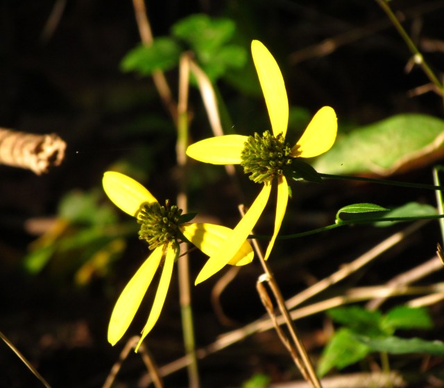 That early in the morning color, as you see, is difficult to find. In the winter it will be nearly absent on overcast days. Some of the remaining flowers are whole, but most are threadbare or gone. This one is threadbare but the yellow is so bright: