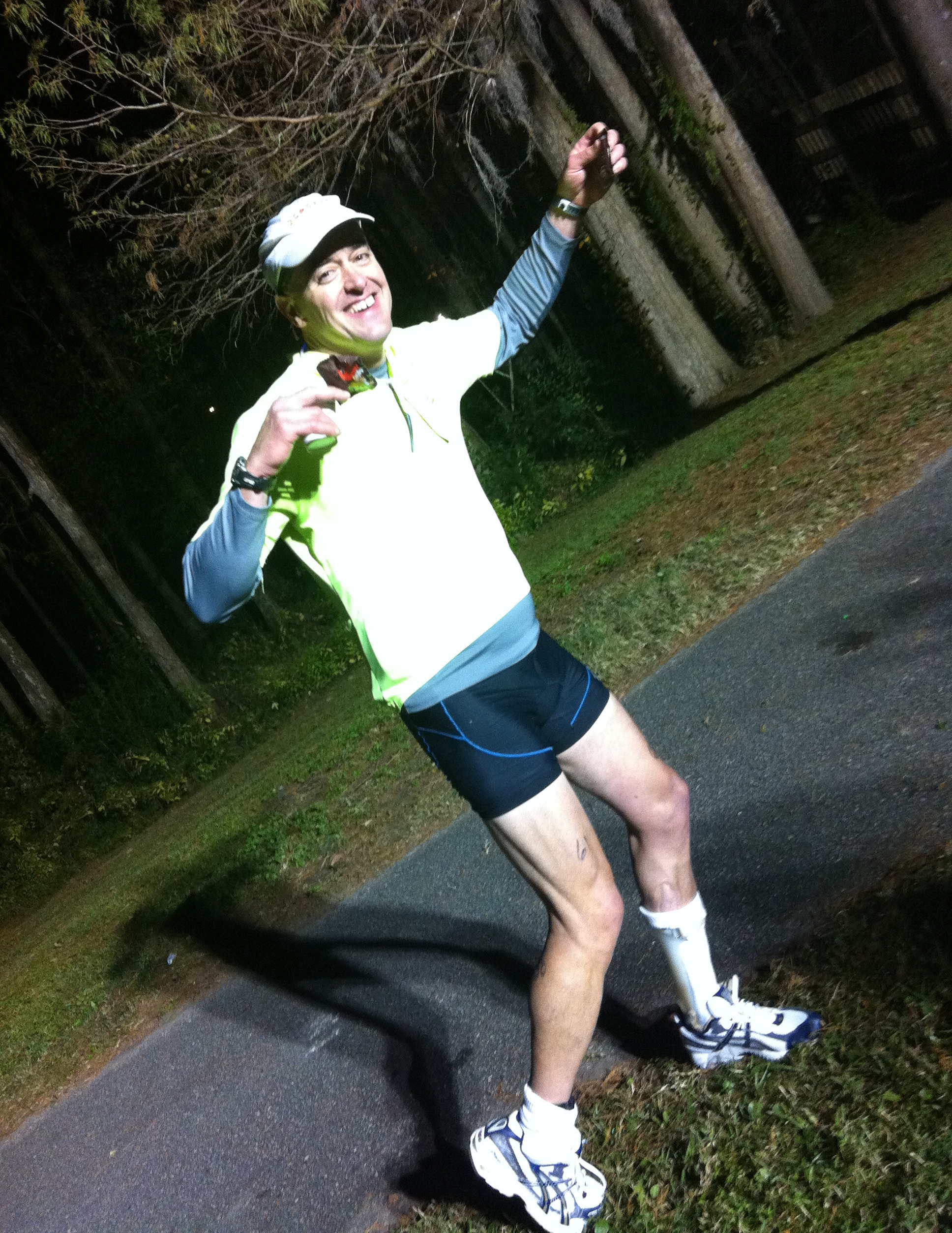 So anyway, I’ve done triathlons since 1987, I’ve done over 120 including sprints and olympics and half irons and ironmans. I’ve passed over a thousand aid stations where they hand out drinks and snacks and water and Advil and everything a hungry or tired or sore athlete could desire. And I have never seen an m&m. I stopped at an aid station on my second loop of the run and they had everything in the world you could want, including delicious trail mix, but of course no m&m’s. I said to one of the people working there “you guys really need to have m&m’s – everybody would eat them.” She said that would be fantastic, was in complete agreement. I jogged a few more miles, hit the turn around for the final loop of the run and stopped at the aid station just after the turn. 6.55 cold, dark, tired miles ahead of me. And they said “can we get you anything?” and I look on the table and there must have been a hundred packages of m&m’s. How does this even happen? It’s an endurance athletics miracle. People were taking pictures right there; I handed them my cell phone. I’m holding a pack of m&m’s in each hand. This is what a happy athlete looks like. Remember, when this picture was taken I’d been “racing” for probably fourteen hours: