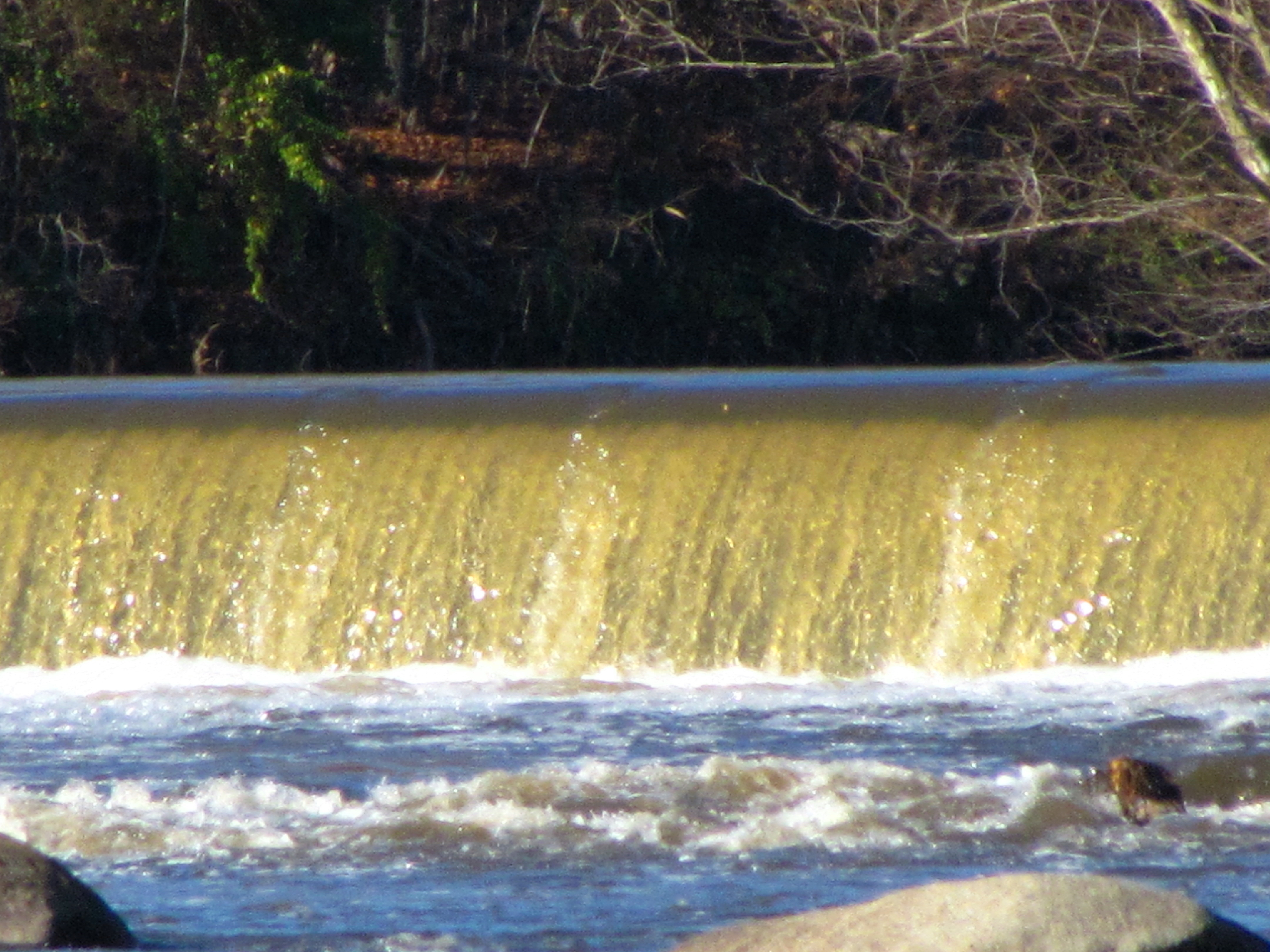 When you get to the parking lot a Pony Pasture and go down to the river and look across and a tiny bit upstream, there’s a dam way over there. It’s called the Williams Island Dam and I took this grainy-ish picture of it on Friday, 18 November. This is zoomed in 140x so it won’t be nearly this obvious if you’re looking from Pony Pasture. But it’s over there. You can look on Google Maps at this image of Williams Island. Zoom in a little and you’ll see the dam on the lower right of the island.