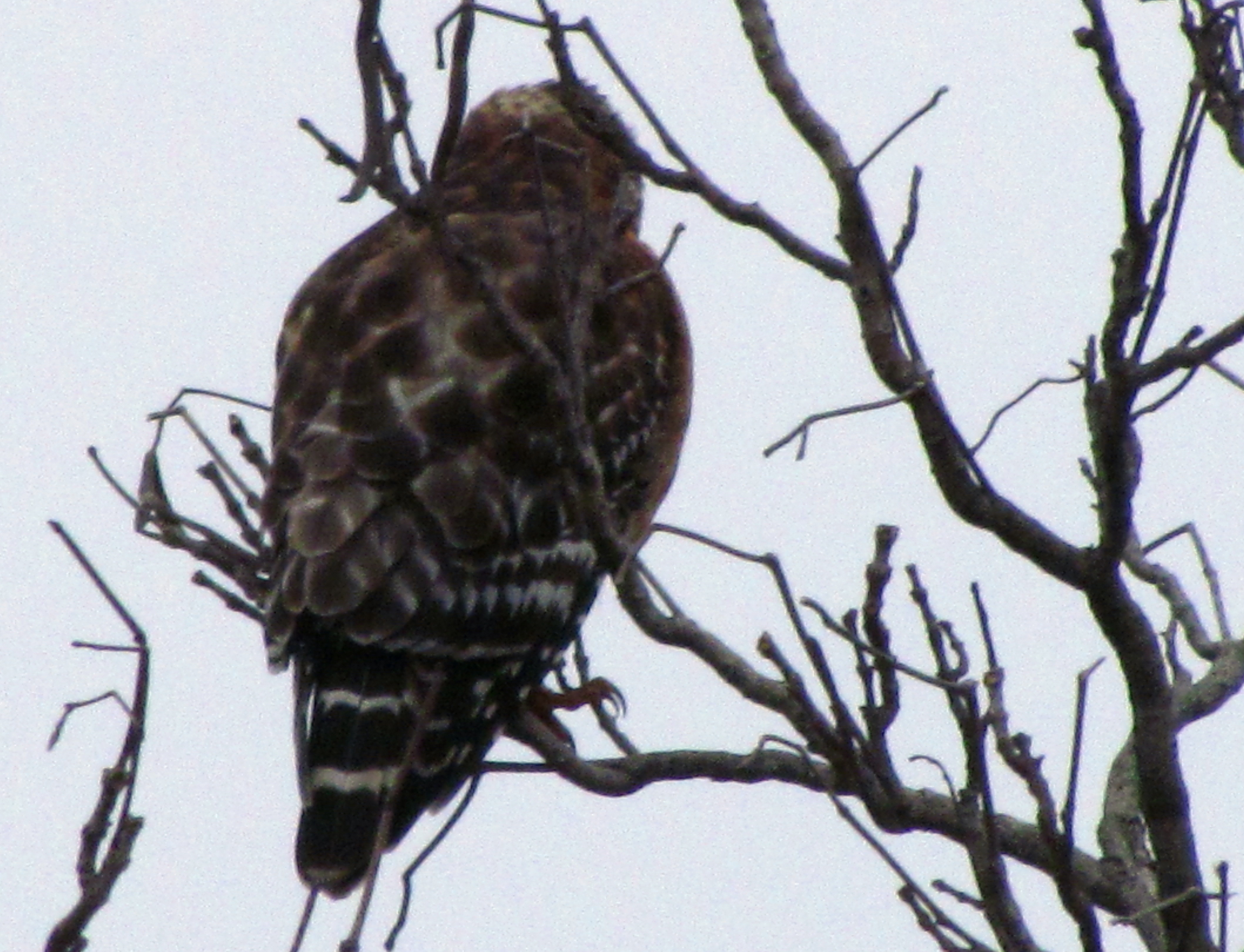 Also, I’ve gone with my friend David to Starbucks a time or two, plus this week we went to the Y for the first time and made a trip to the Westbury Pharmacy. When we were at Starbucks Monday there was a Red-shouldered Hawk (thanks for the ID Kim!) in a tree across the street facing away from us: