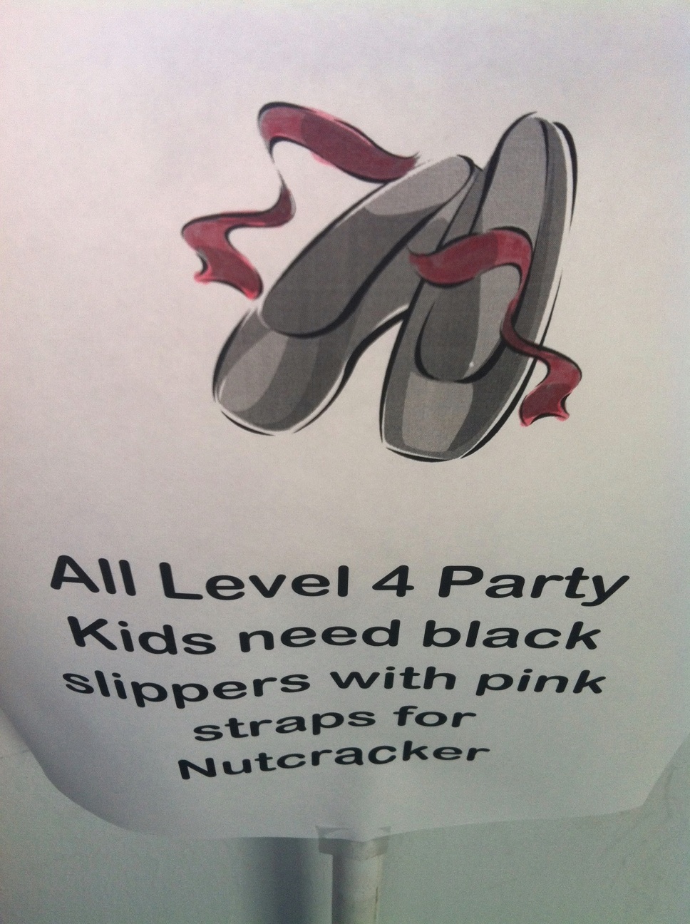 At one point we went to an old building (there were lots of old buildings) where there was a craft sale in one section and children of various ages practicing a performance of The Nutcracker in another. This sign caught my eye. It’s great they have a group called “Level 4 Party Kids.” I never learned what the Level 3 or Level 5 Party Kids needed. Silver slippers with blue straps or something. Or even cowboy boots or Teva’s with candy cane socks, how would I know? The possibilities are limitless. I just like the concept of “Level 4 Party Kids”: