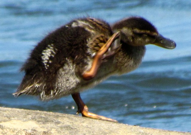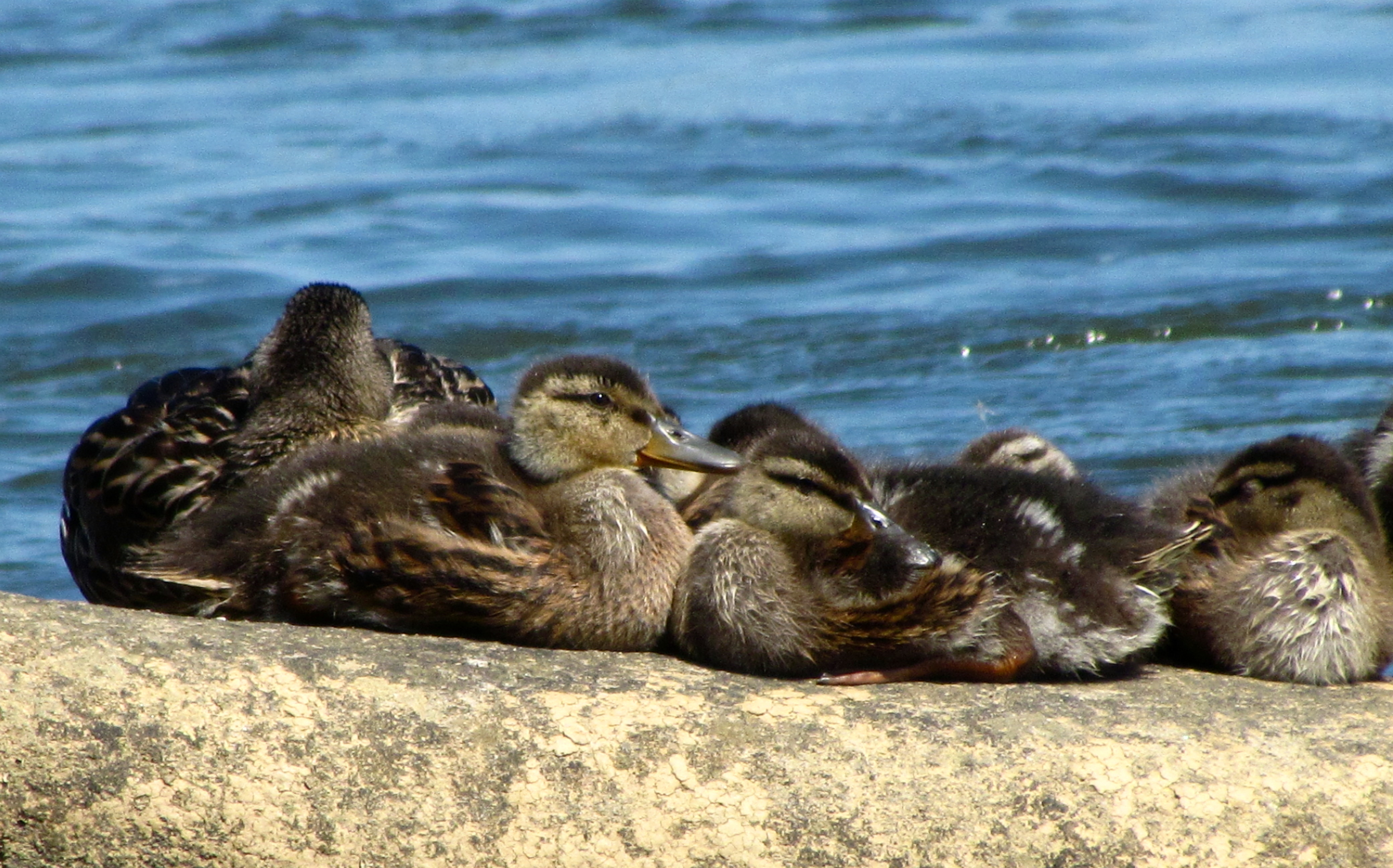 I see my last blog post was way back on June 2 – that was a Saturday. Of course Evelyn and the dogs and I were down at the river the next morning; it’s still bright and Springy-looking. Spring presents itself non-stop in a million ways. One is baby anything, and it’s hard to go wrong with baby mallards. I saw a nice looking family of ten swimming around with a female who I presume was their mother. Here’s  one watching the river go by while his brother (or sister) snoozes behind him. I think male and female babies maybe indistinguishable. Maybe the males don’t get their distinctive green heads for a while:
