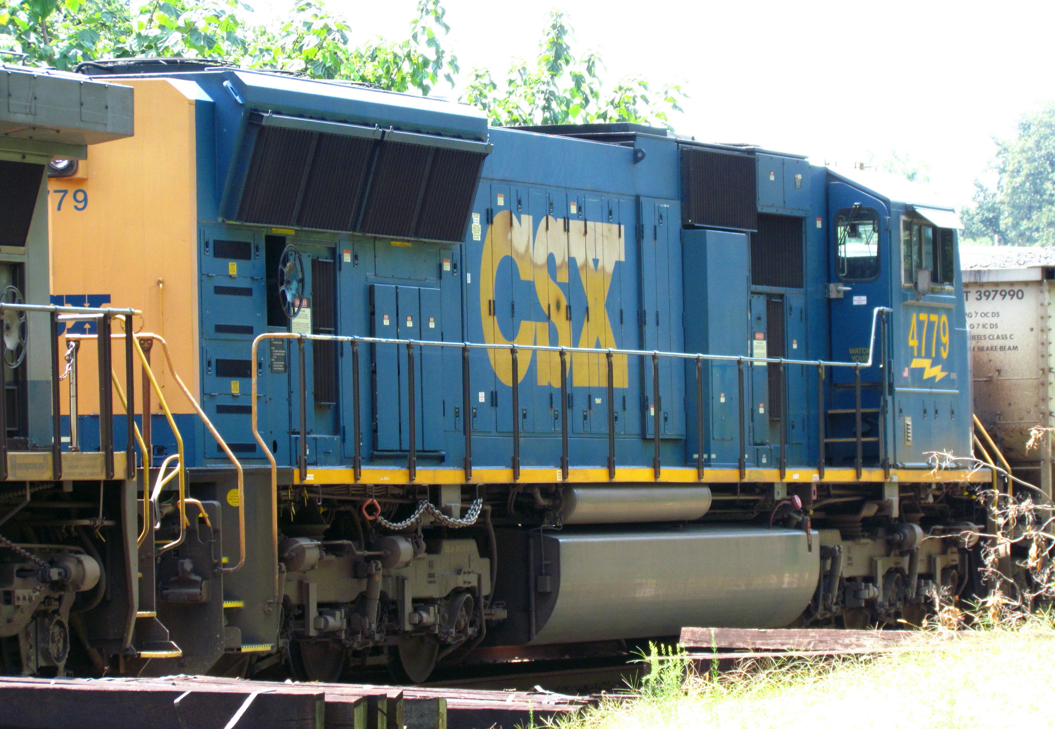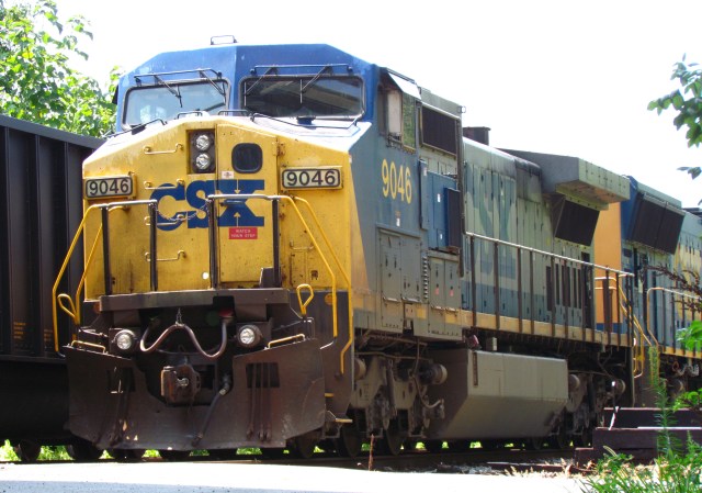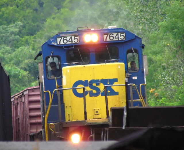 This is a C40-8; it’s not a great shot except you can see one guy in each window of the locomotive. You can see a boxcar behind it so that’s a “mixed freight.” In other words, not as heavy as a coal train, which means it needs a less powerful locomotive. These C40-8’s are “only” 4,000 horsepower each instead of the 4,400 HP locomotives typically found on the front of coal trains here in the Piedmont region of Virginia. My friend that I go trainspotting with tells me that one is the engineer and one is the conductor:
