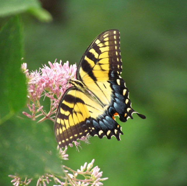 Speaking of moving slow (and nice-looking bugs) I was hiking at the river a week or so ago and saw this lovely female Tiger Swallowtail. If you’re ever looking at one, I learned that you can easily tell the males from the females. The females, like this beauty, have blue trailing edges on their wings. The males have black. Also, the females are much bigger, and so of course are easier to photograph: