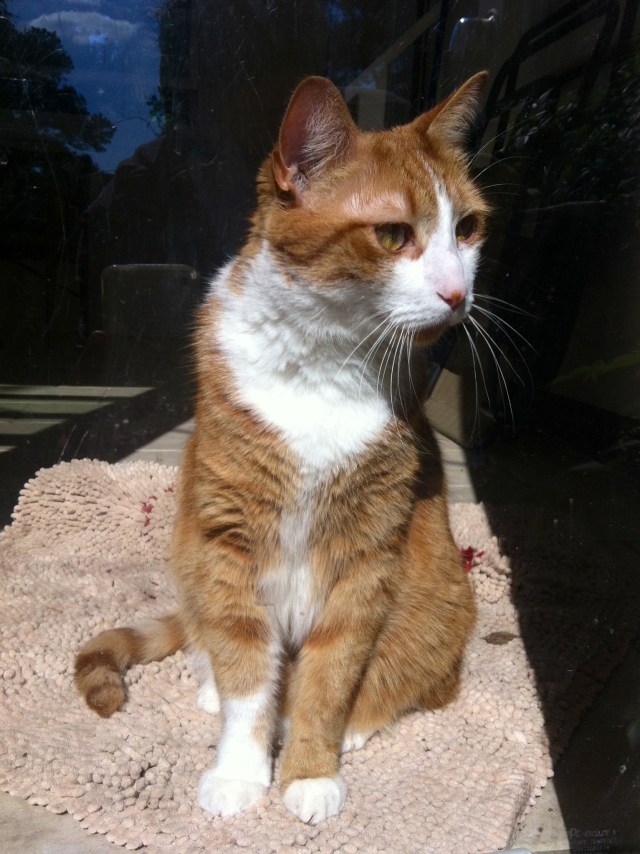 I took that rose picture with my “real” camera but I used my iphone to get this picture of Dash, my cat, looking out the back porch door: