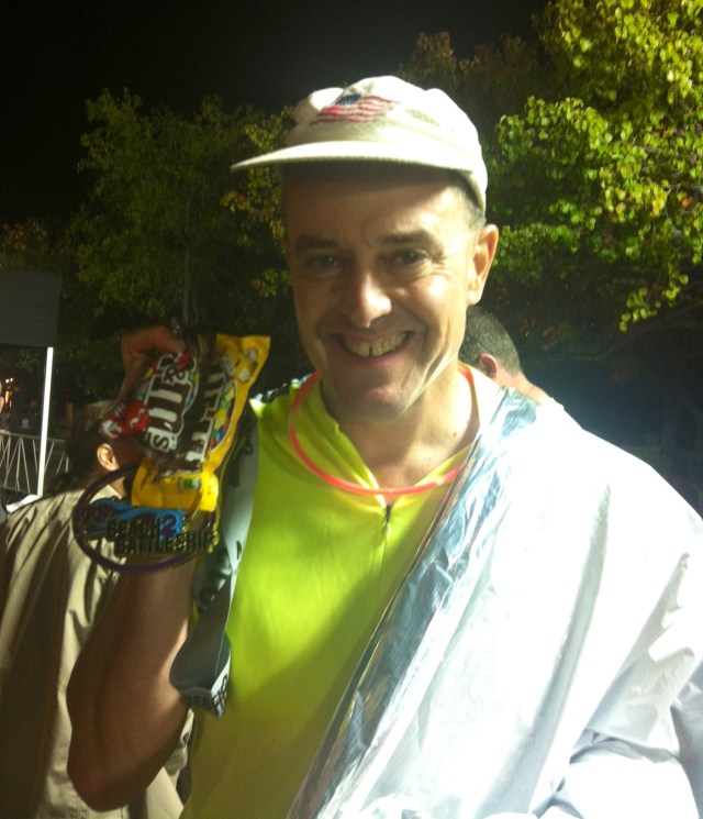 My walking stride mostly passes for normal. But my running gait is in equal parts inelegant, ungainly and awkward. Noticeable from a long way away, especially since I’m tall and wear a brace on my leg. And in 2008 there was a volunteer on the waterfront named Ryan and we chatted for a moment or two. On each loop of the run. We resumed our brief acquaintance each year at B2B on the run. Last year I told him how happy I was about the m&m’s. This year – I see this guy once a year, for fifteen or twenty seconds – he says “Jay! How’s it going! Did you get your m&m’s this year?” I smiled and said no but I’m having a great time and headed back out for my second loop. The run took me  over seven hours, so it was a long time before I returned. And when I did, Ryan is standing there holding one pack each of plain and of peanut m&m’s. Because he wasn’t sure which I liked better. And that, folks, is why I go back to B2B every year. Not because of m&m’s. Not even because of Ryan. But because that enthusiastic, engaging, people-focused attitude pervades every facet of the race experience. Here’s me at the finish line: