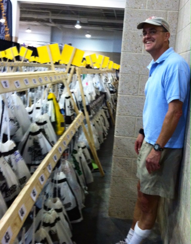 Evie took a picture of me the evening before the race in T2, the bike-to-run area. These bags each had our race number on them (this year I was #47) and all of our gear for changing from the bike to the run. There was a changing tent at the end of the racks. I handed my bike off to a volunteer and went in and took my helmet off and put my running shoes on and headed out. Here’s what T2 looked like the night before the race: