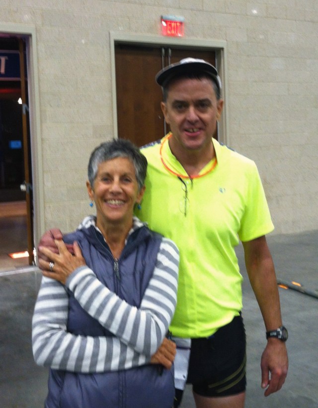 She helped me get all my stuff squared away, we went to eat, etc. I get extremely anxious the night before my race. Mostly because I’m not confident my bike, helmet, running shoes, wetsuit, all that stuff, is in the right place. I’m always confident in my ability to swim 2.4 miles, bike 112 and run 26.2 – I have zero anxiety about that. But the details make me edgy. Evie’s a confident and capable organizer and helped me be calm on race day eve. And got me to the starting line in one piece. Then we didn’t see each other for nearly sixteen hours! But I think she had a great day and I know I did.