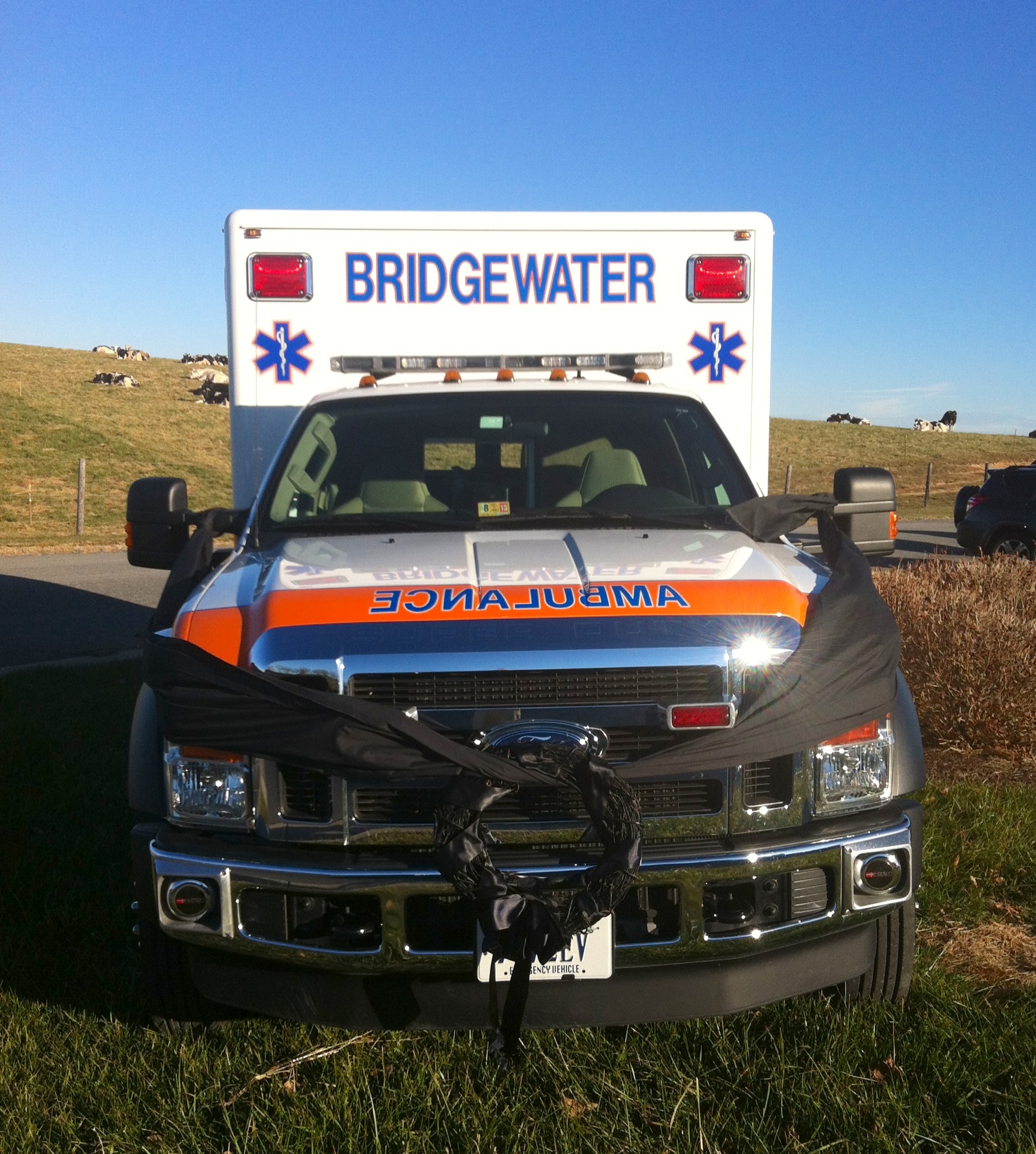 One of Dad’s REAL ambulances! Draped in black bunting for his memorial service.