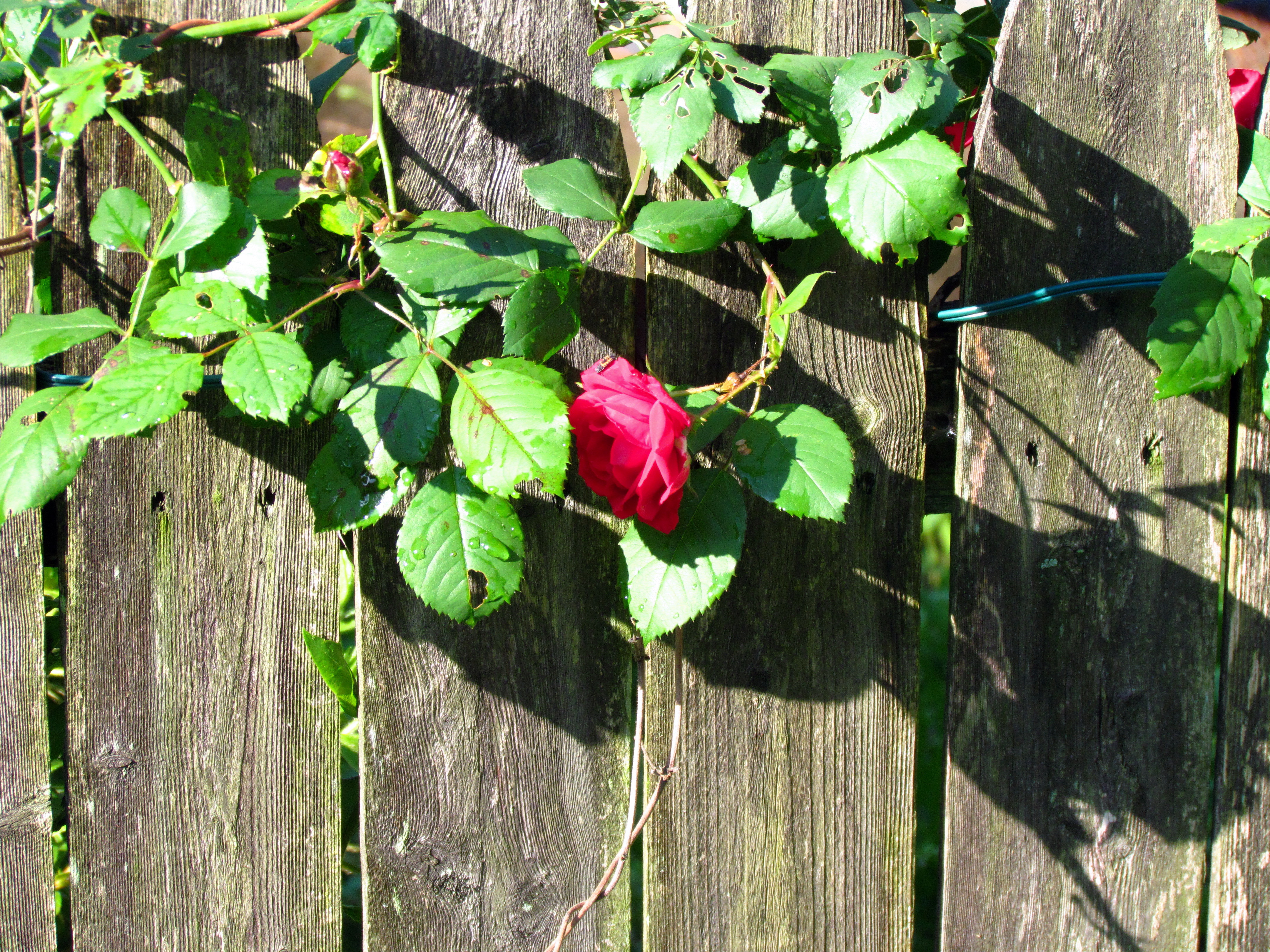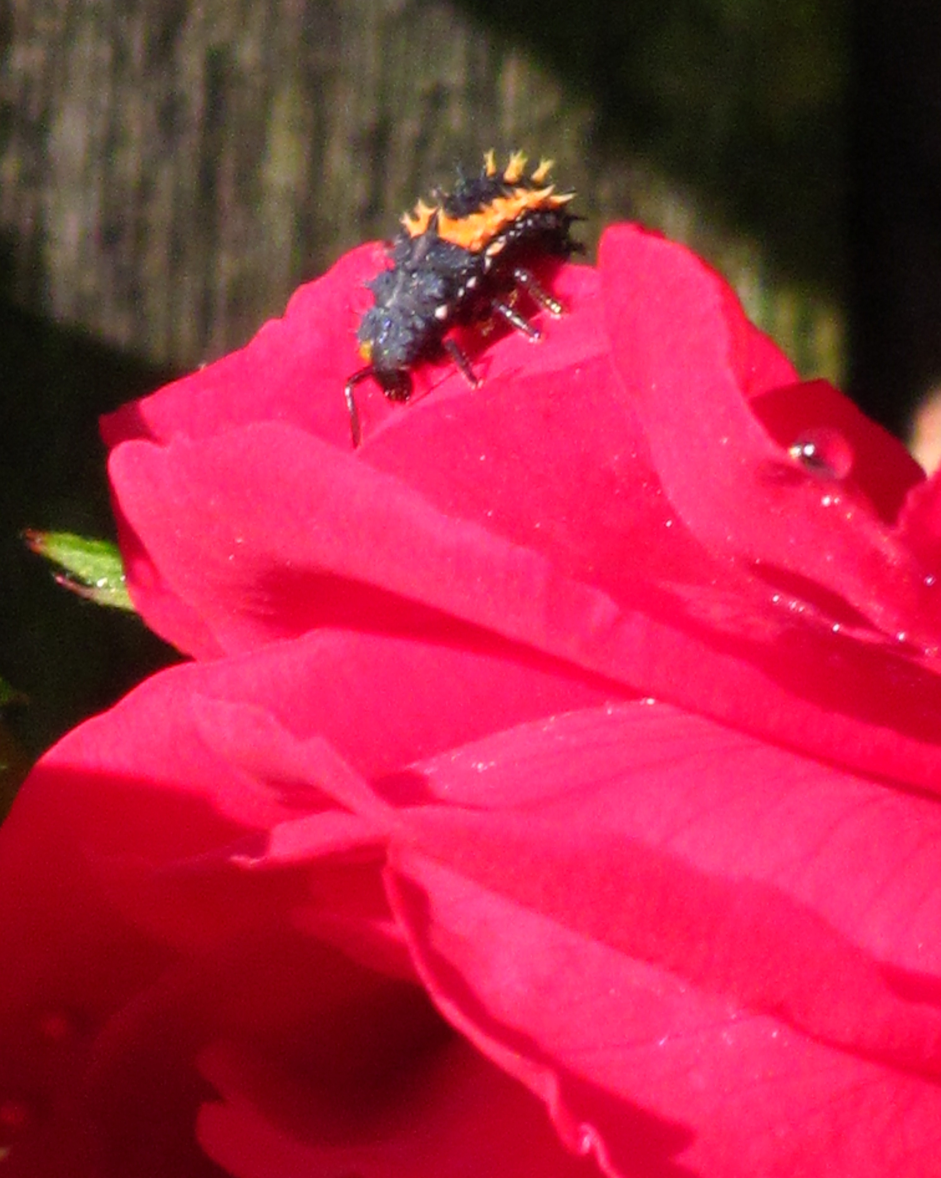 Later when I came home – speaking of bugs on flowers – I found this attractive neighbor climbing our side fence:
