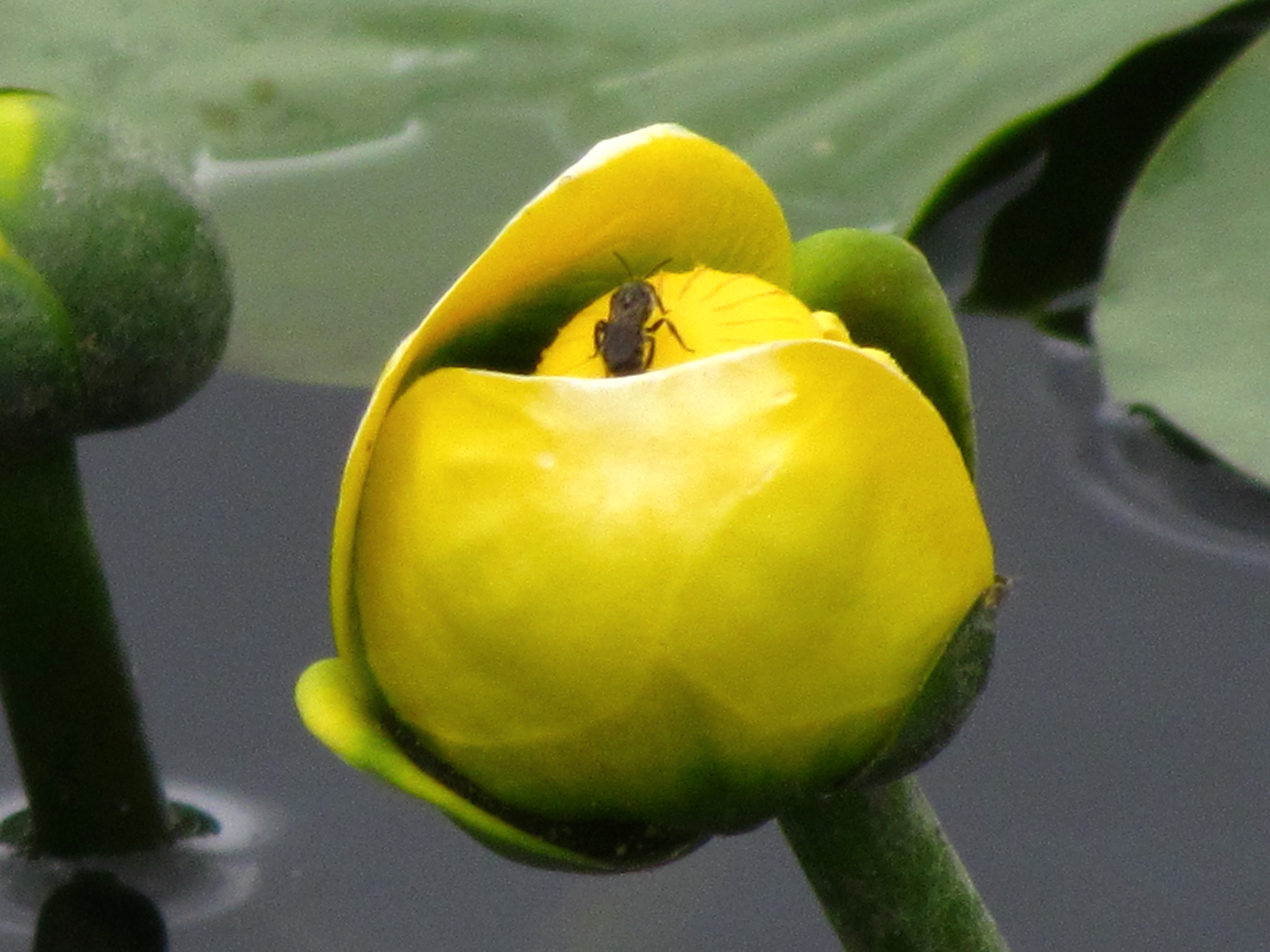 But mainly flowers, birds and bugs. Spring becomes more summer-like each day and everything is moving faster. Remember – if you’ve seen this blog before – the pretty frog picture I posted in mid-April? The post was Froggie? I took that picture when the air and the water were cool. That makes frogs move slow. When my buddy and I walked up that frog was not interested in moving off his warm perch. We walked by the same spot at Bryan Park last week when it was close to 90º. The moment we came in sight that frog disappeared into the water with a loud splash. Reptiles and amphibians are moving much quicker. The plants are doing what plants have always done, and the bugs are in their usual state. There are big patches of lily pads at Bryan Park and last week they had bright yellow flowers on them. I took some pictures from a long way off and when I got home I saw this bug: