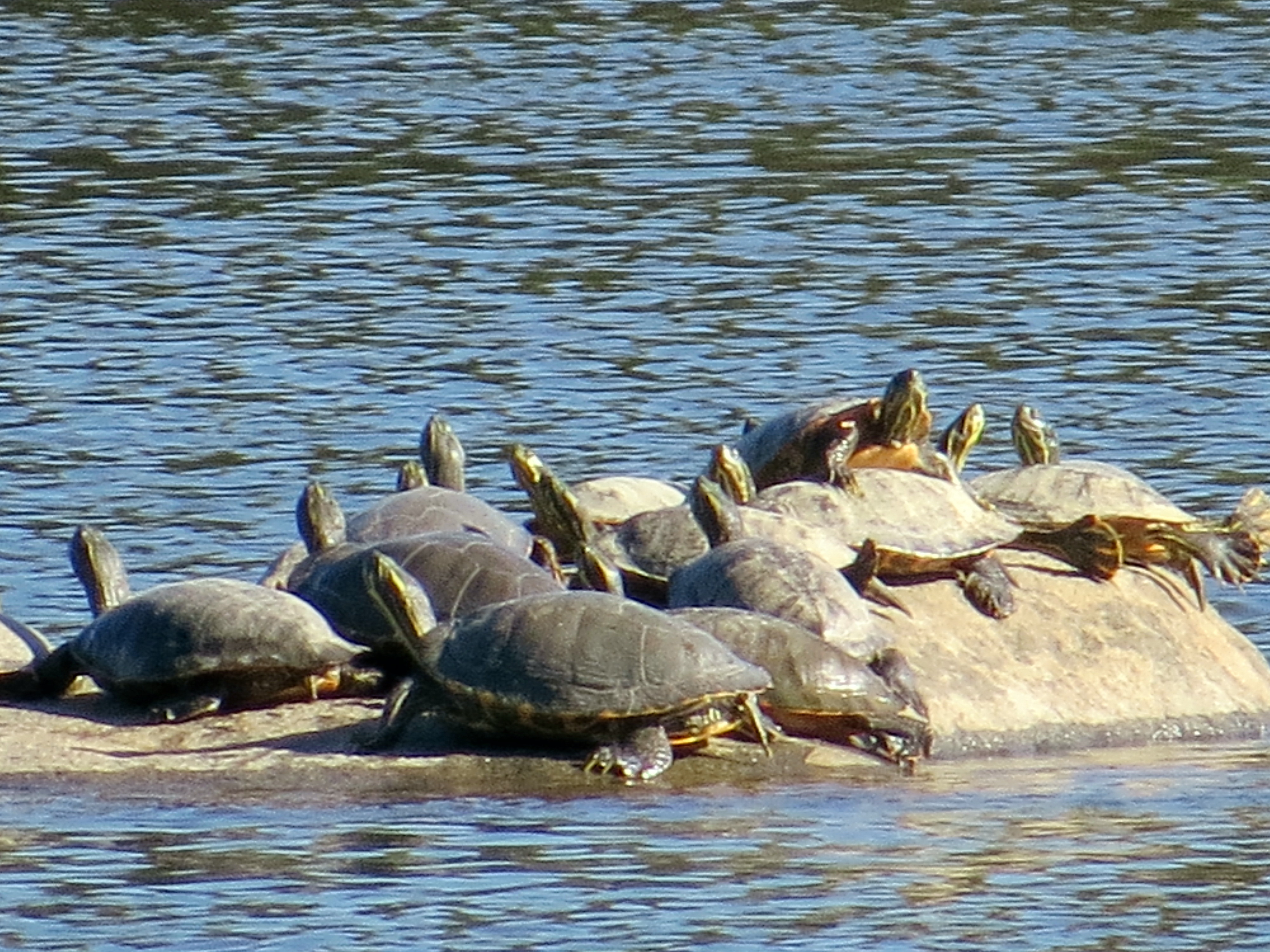 Human beings (with notable exceptions) are warm-blooded – we have an internal heat source. Not so for turtles, they rely on the environment to keep warm. Mackey and Turner and I were at the river on October 15th. In mid-June the sun rises around 5:45 AM and sets after 8:30 PM – it’s above the horizon for nearly fifteen hours. If you rely on the environment to keep warm, you are loving life on those long days. We all notice the days getting shorter, but if we pay our utility bills and dress right we keep warm no matter. When we were at the river on the 15th, the sun rose at 7:15 and set at 6:30 – above the horizon for barely 11 hours. These guys don’t have calendars or anything else but they are totally making the best of these shortening days. Notice their heads are way out of their shells and check out those guys on the right, spreading their toes to get every last bit of sunlight: