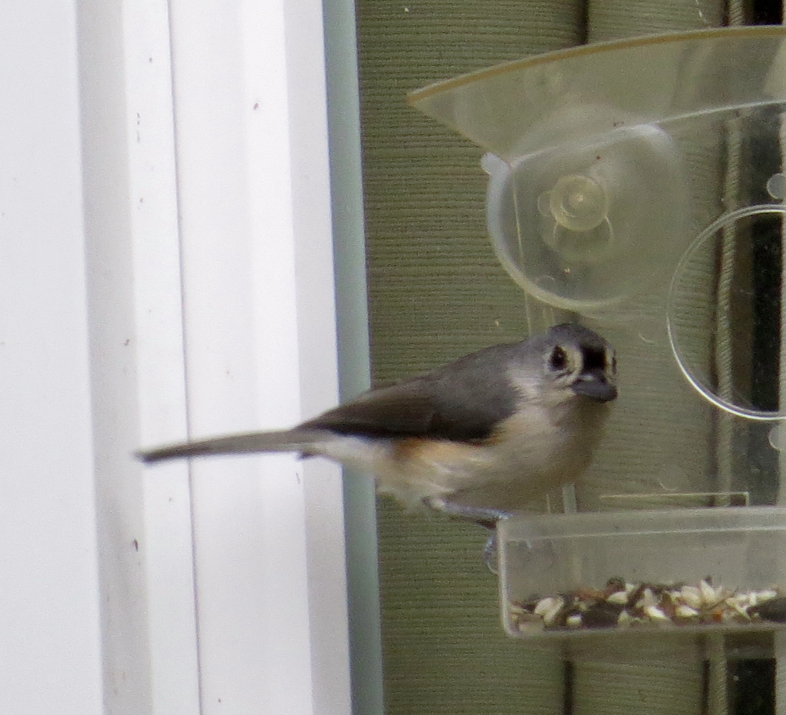 I took a little time off filling bird feeders but I bought some bird seed and we’re at it again. I took these pictures out of my car window so the focus is not what I’d like. I’ll perfect it. This tufted titmouse was filling up: